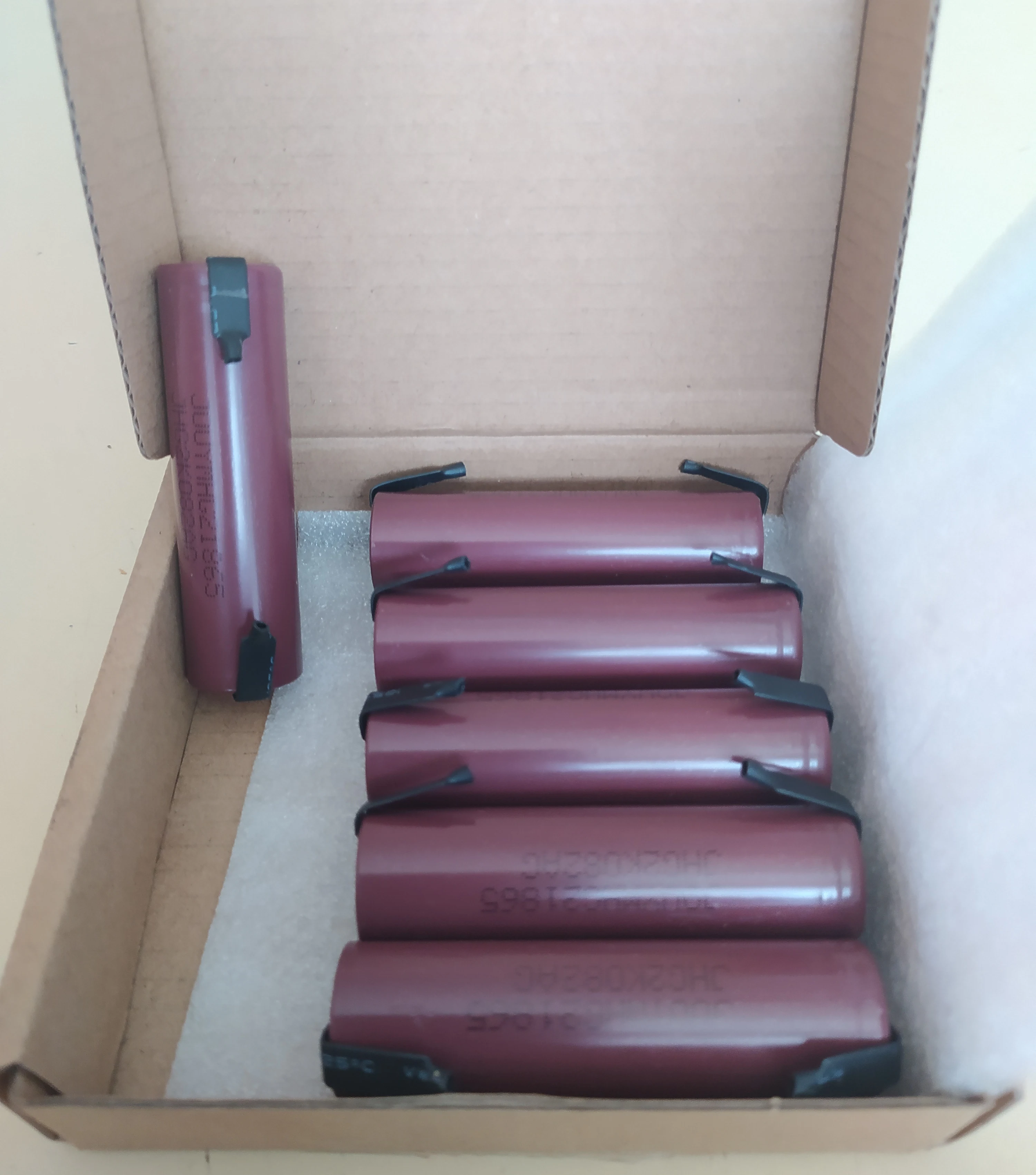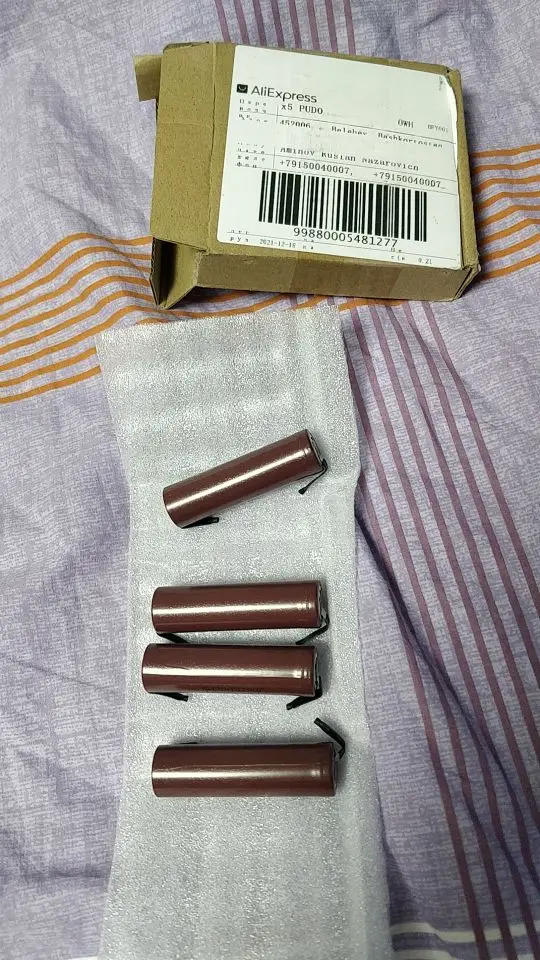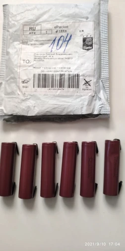 Заказал 13.09.2021 четыре штуки за 619,78 руб., получил 29.10.2021 (за 46 дней). Доставка Seller Shipping Method. Аккумуляторы завёрнуты во вспененный полиэтилен и ничем не скреплены - это может быть чревато коротким замыканием и возгоранием при доставке, но в моём случае этого не случилось. Маркировка JOUYMHG21865, но без наклейки как на фото товара. Термоусадка сделана не аккуратно, возможно не оригинал. Напряжение аккумуляторов 3.72 - 3.76 вольта. Емкость и сопротивление проверить нечем, так как я заказывал аппарат для тестирования аккумуляторов четыре раза и он до сих не пришёл.