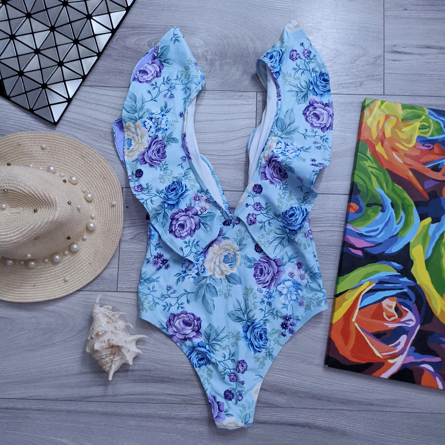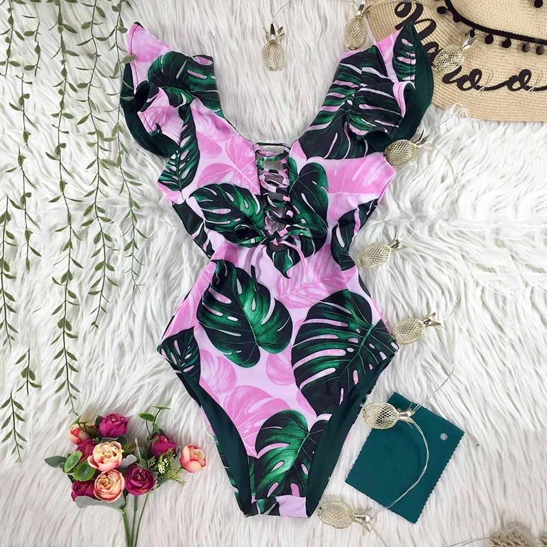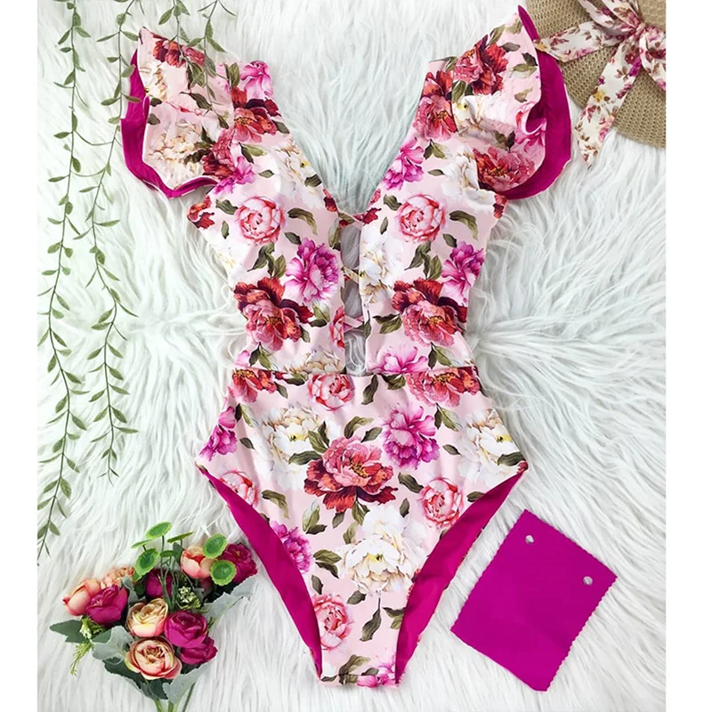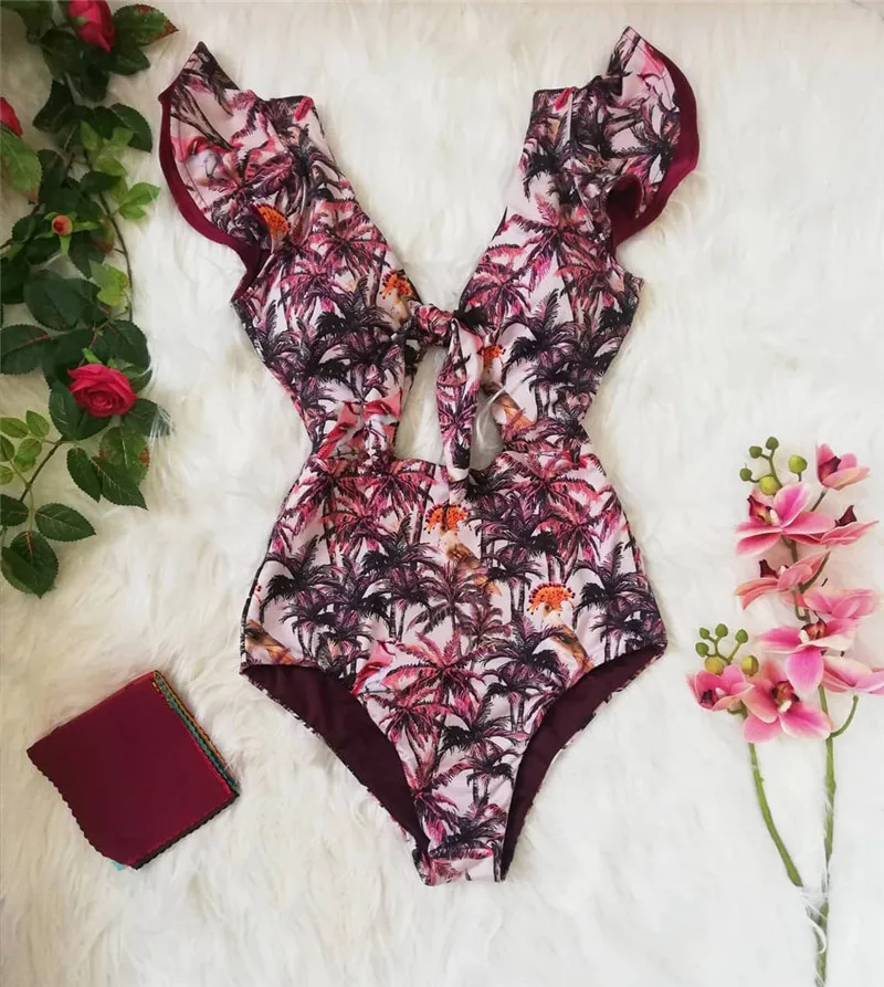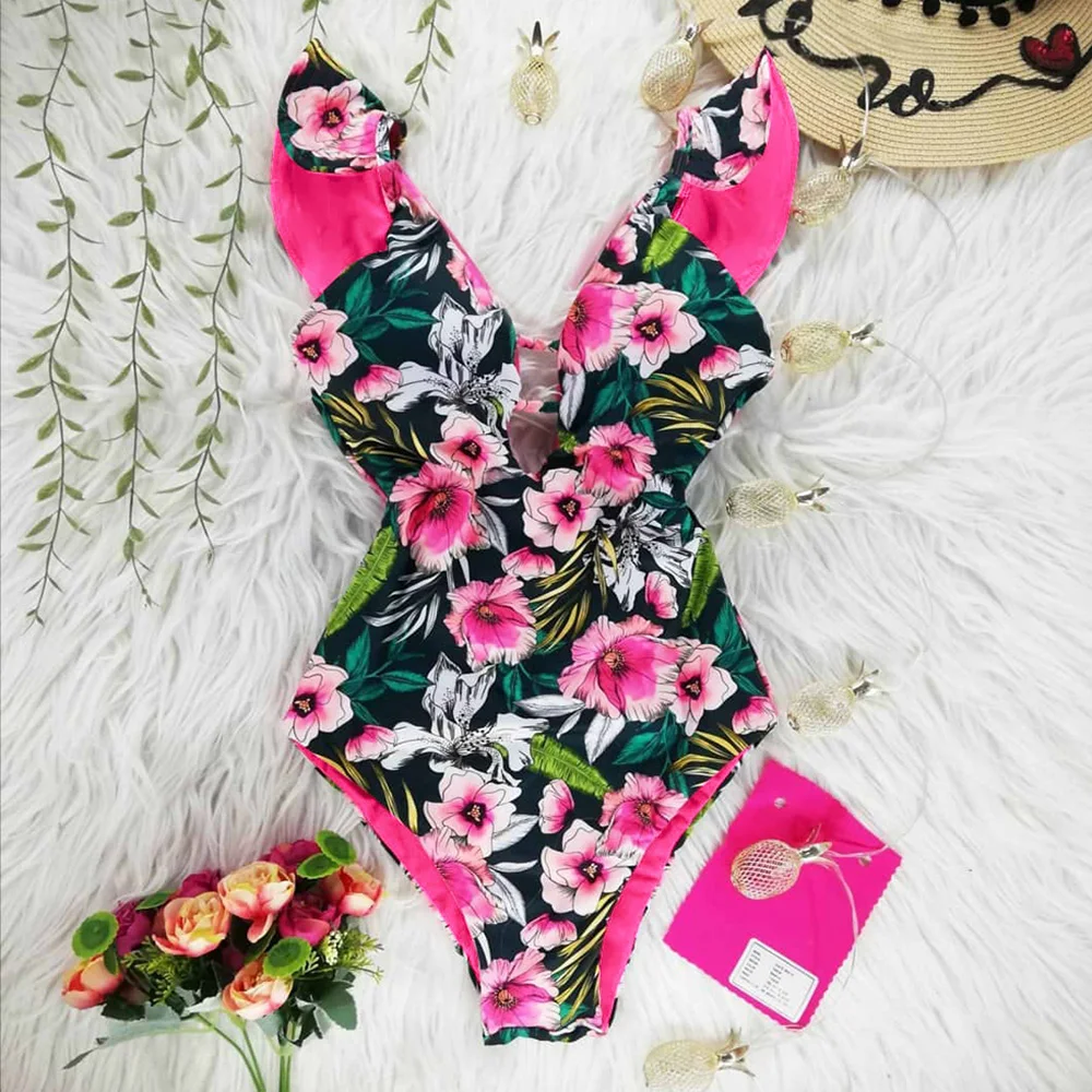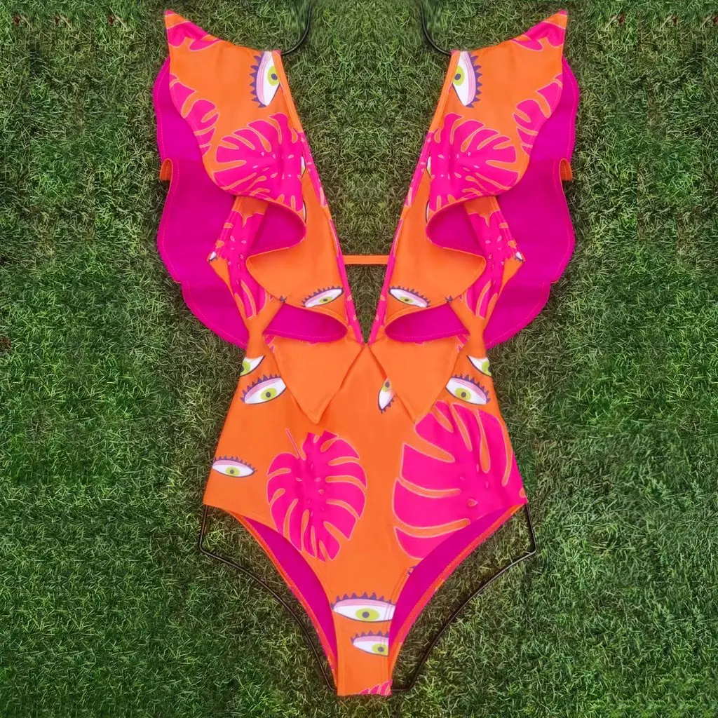 Новинка 2022, купальник с принтом, купальник с глубоким V-образным вырезом и оборками, слитный купальник с пуш-ап, пляжная одежда, монокини с открытой спиной