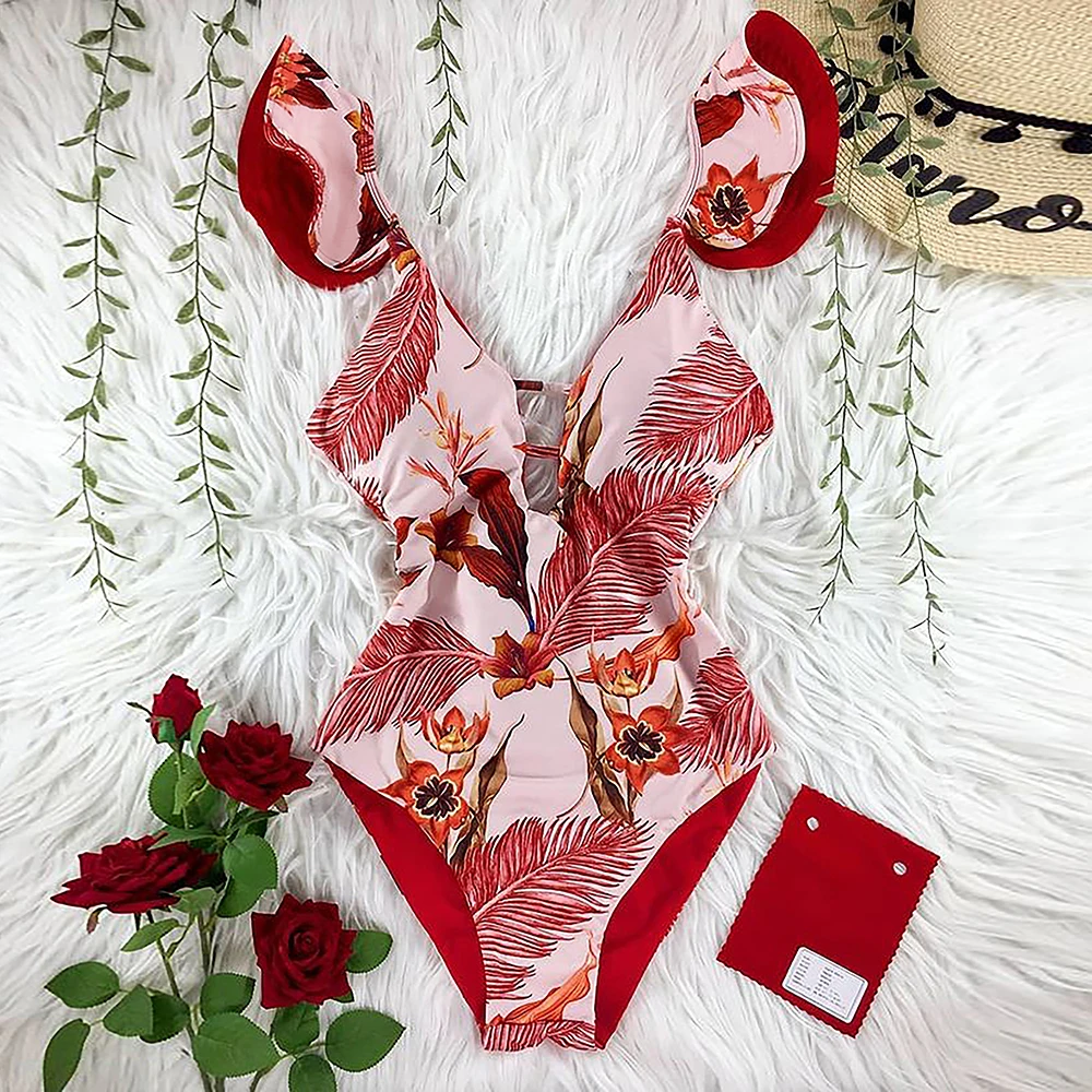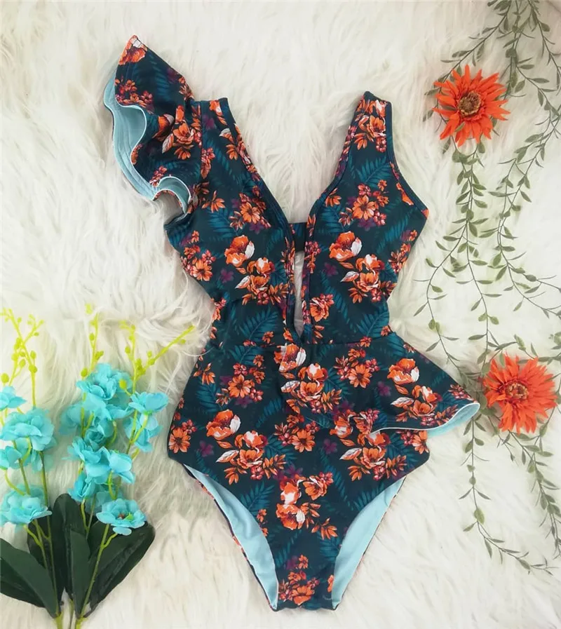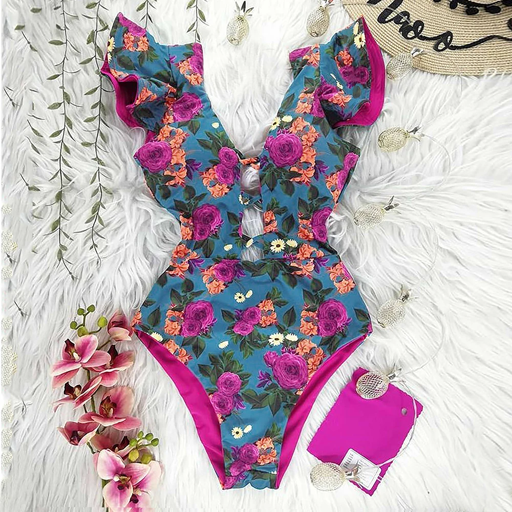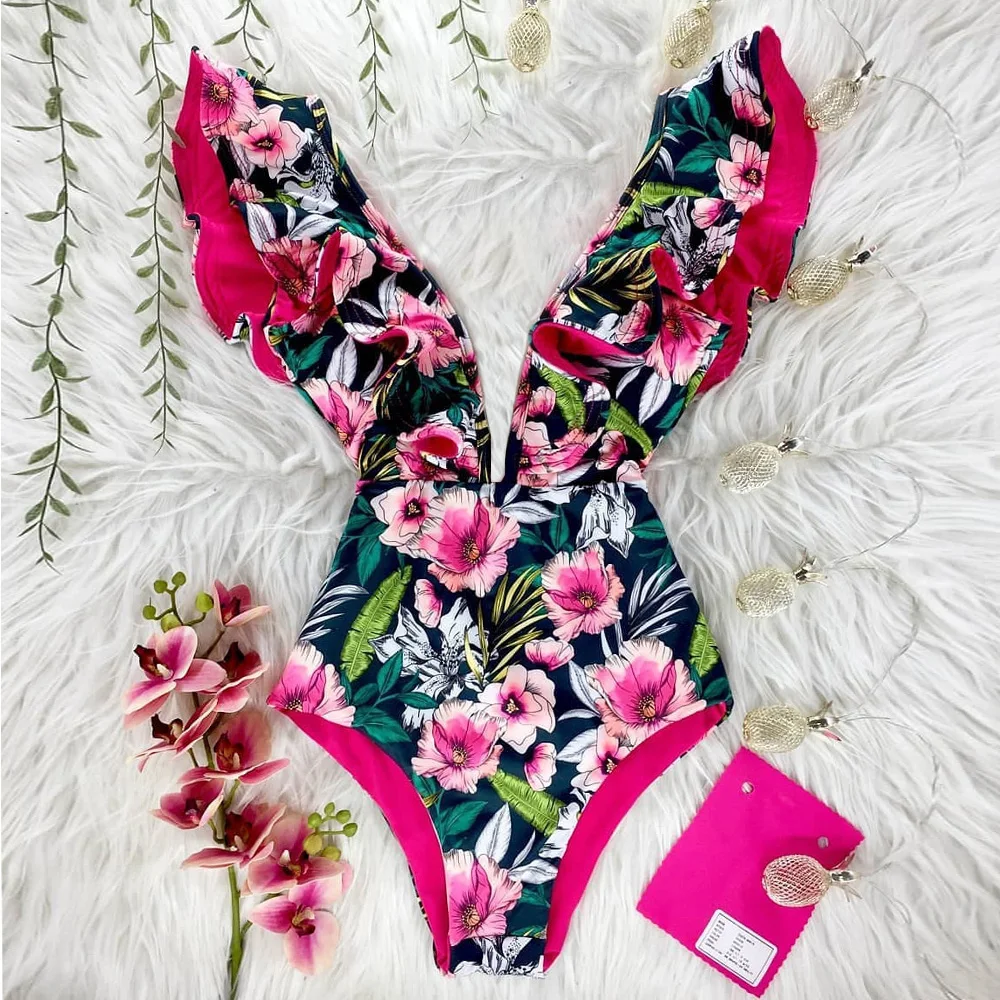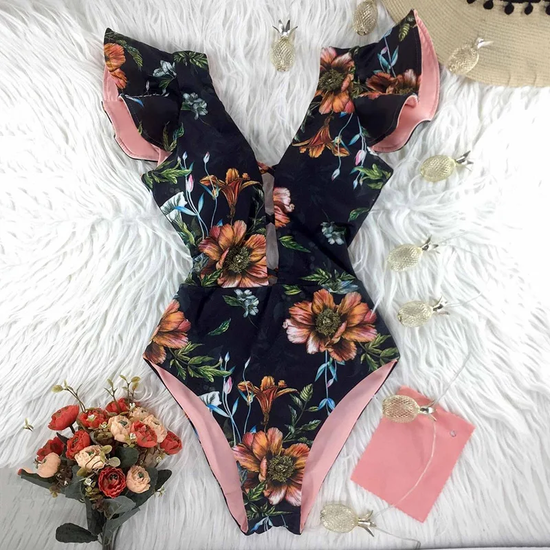 Новинка 2022, купальник с принтом, купальник с глубоким V-образным вырезом и оборками, слитный купальник с пуш-ап, пляжная одежда, монокини с открытой спиной
