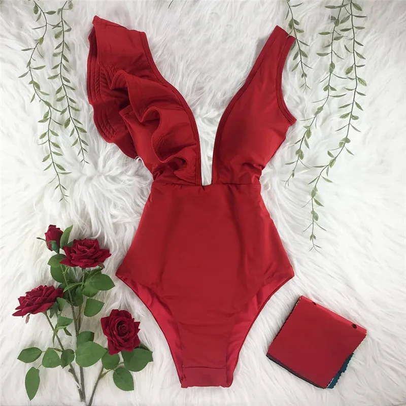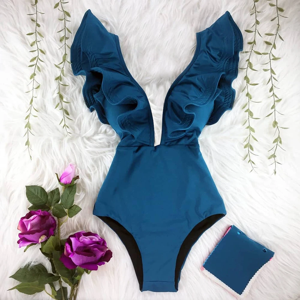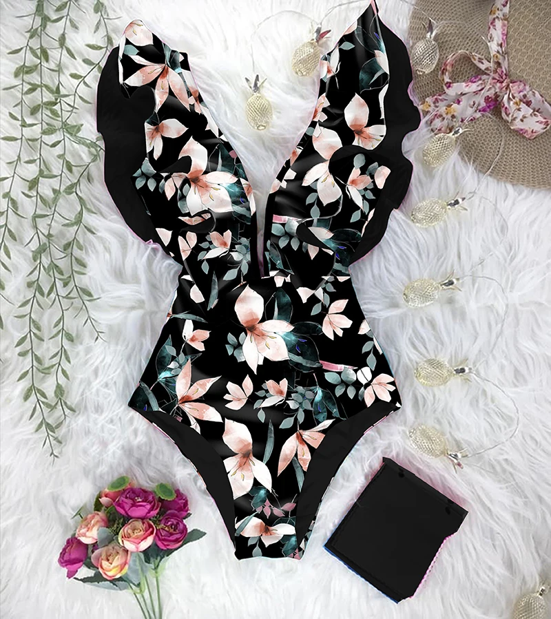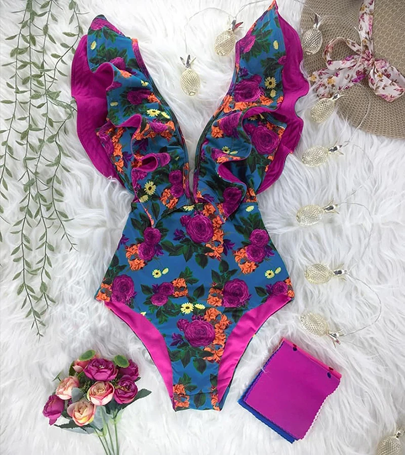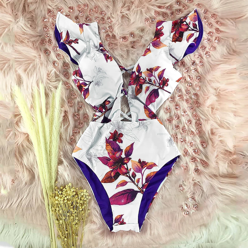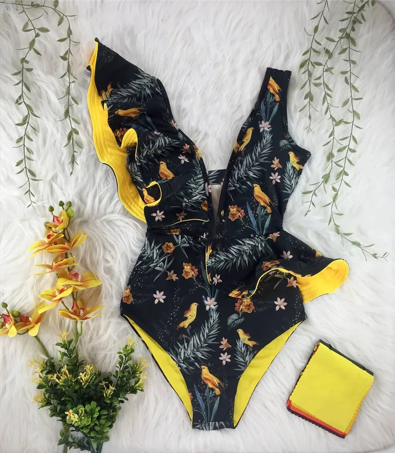 Новинка 2022, купальник с принтом, купальник с глубоким V-образным вырезом и оборками, слитный купальник с пуш-ап, пляжная одежда, монокини с открытой спиной