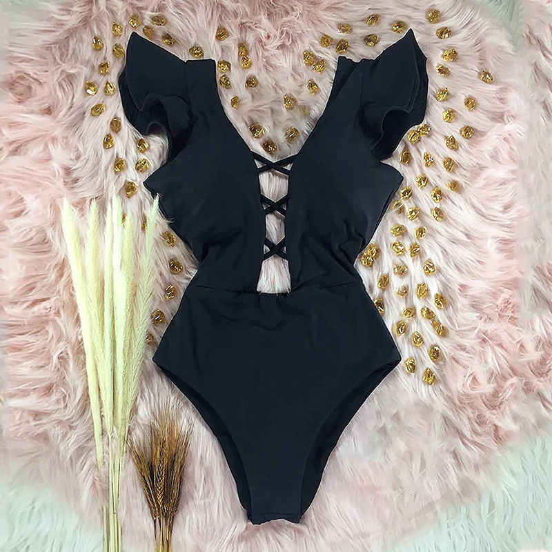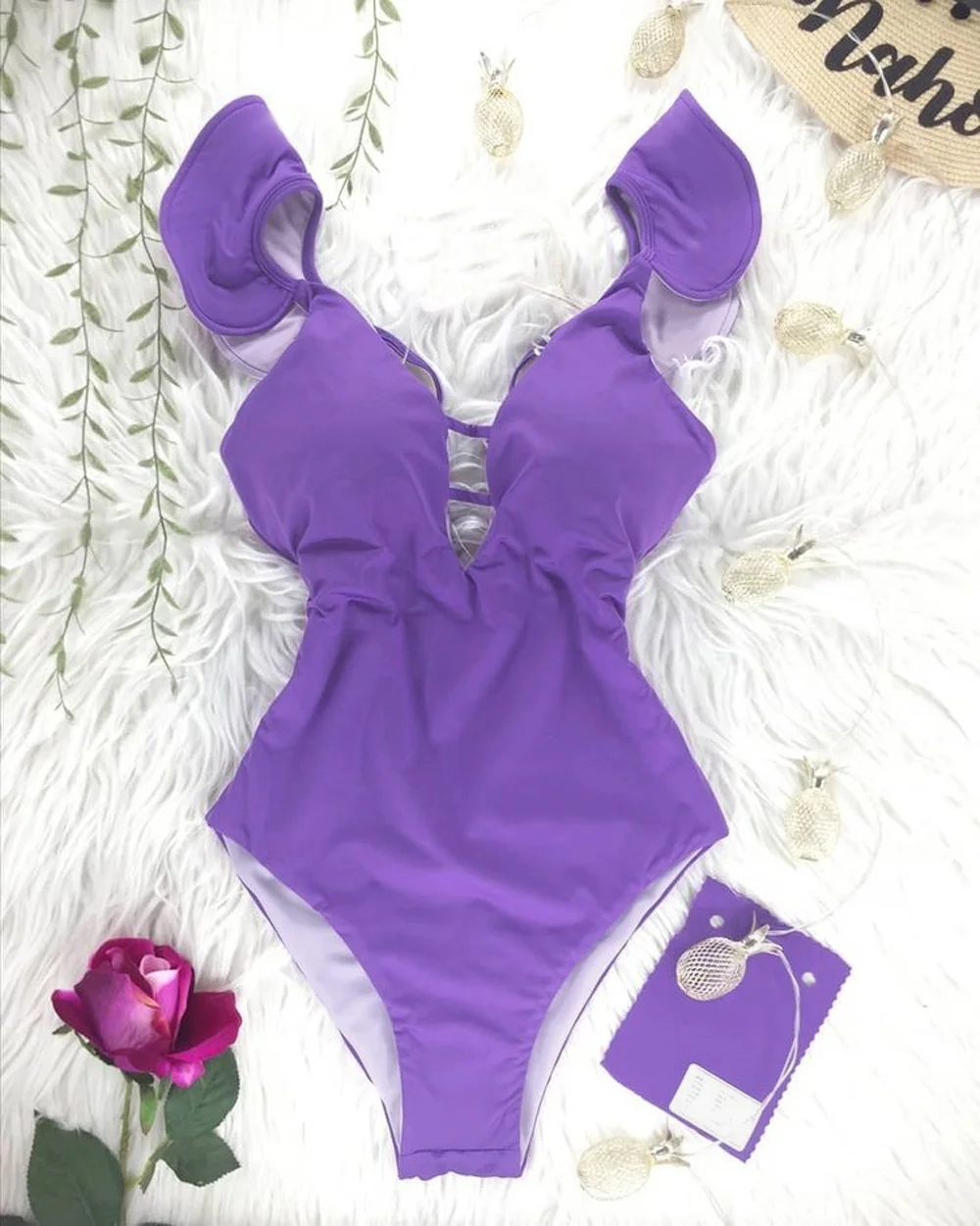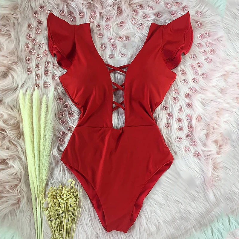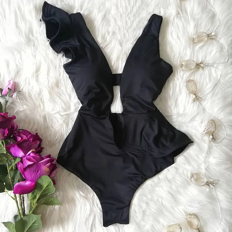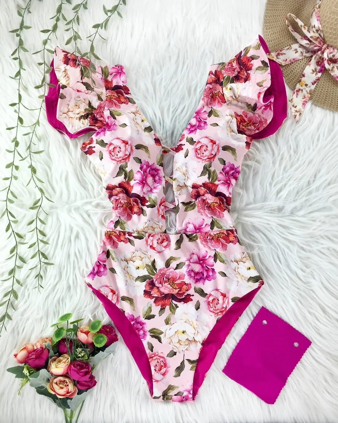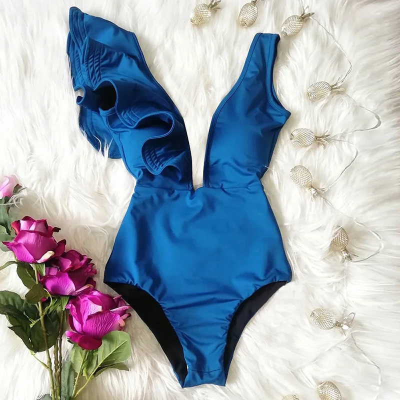 Новинка 2022, купальник с принтом, купальник с глубоким V-образным вырезом и оборками, слитный купальник с пуш-ап, пляжная одежда, монокини с открытой спиной