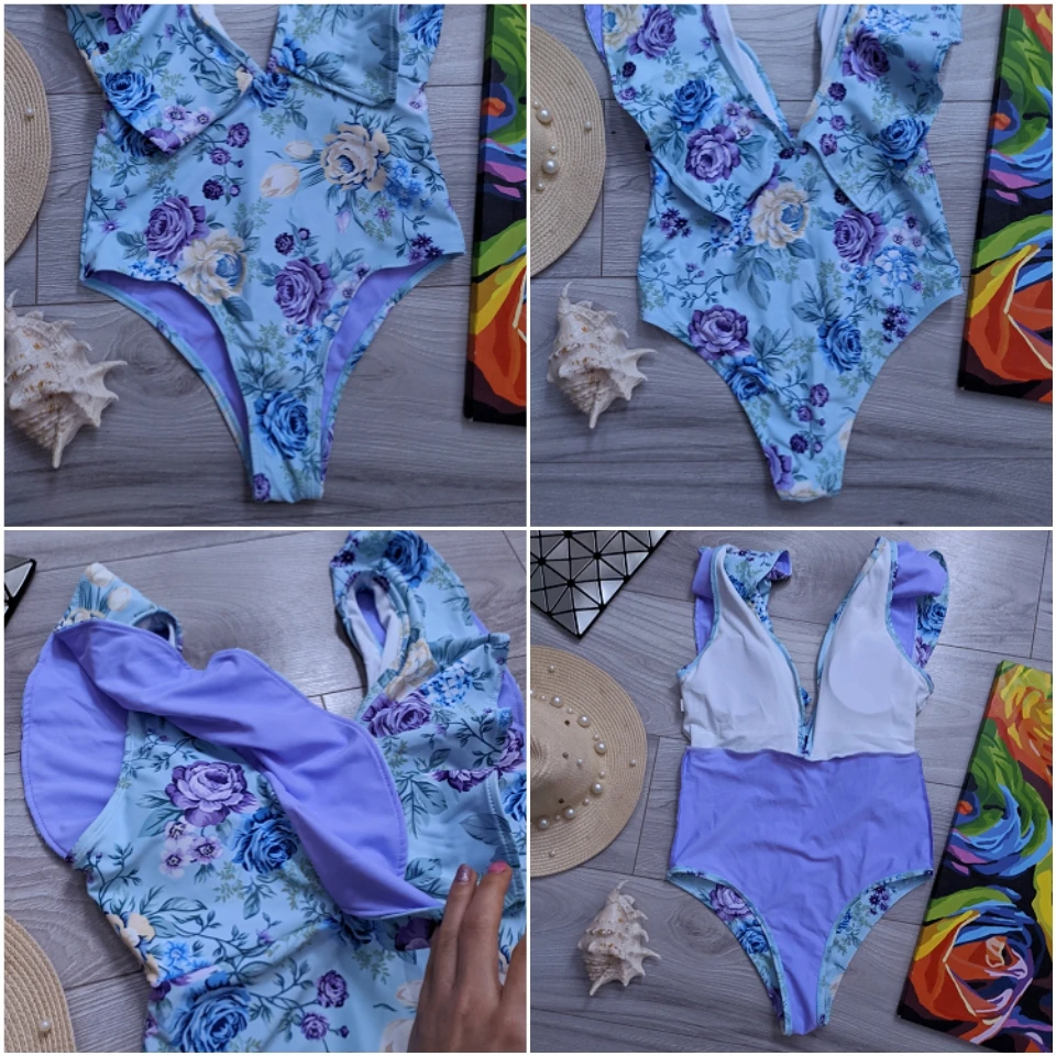 Очень красивый купальник. Размер S подошел. Есть небольшие отличия от фото продавца, это касается пошива, посмотрите внимательнее. Если говорить в общем, то купальник классный, принт потрясающий, голубой с сиреневым смотрятся красиво. Рюши в два слоя, они плотненькие и объемные. В чашечках есть поролоновые вставки, по желанию достаются. На внутренней стороне пришита подкладка, ничего не просвечивается. Классный купальник.