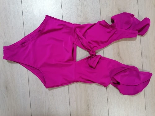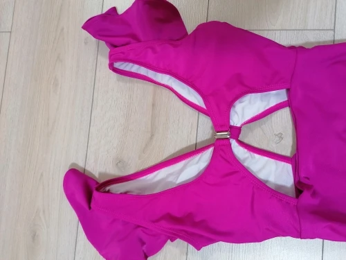 ПОЛНЫЙ ОБЗОР: http://a.aliexpress.com/_eKHsu8 Instagram: @julia_heartbeat Шикарная модель монокини! В Украину купальник шел чуть больше недели. Упакован в небольшой зип-пакет. Гигиеническая наклейка присутствовала. На свои параметры 80/63/80 и рост 150 см взяла размер S. Подошёл хорошо, но зона декольте слишком открытая, пришлось закалывать. Лучше сразу взять модель с перемычкой. По росту тоже сел хорошо. Материал - 82% полиамид, 18% эластан. Пошив отличный. Швы все ровные. Чашки съёмные. Цвет отличается - у продавца он фиолетовый и более темный, в реале - фуксия с синим. Воланы пышные. Спинка и декольте с V-образным вырезом. Мне очень полюбилась эта модель. Выглядит невероятно мило и женственно.