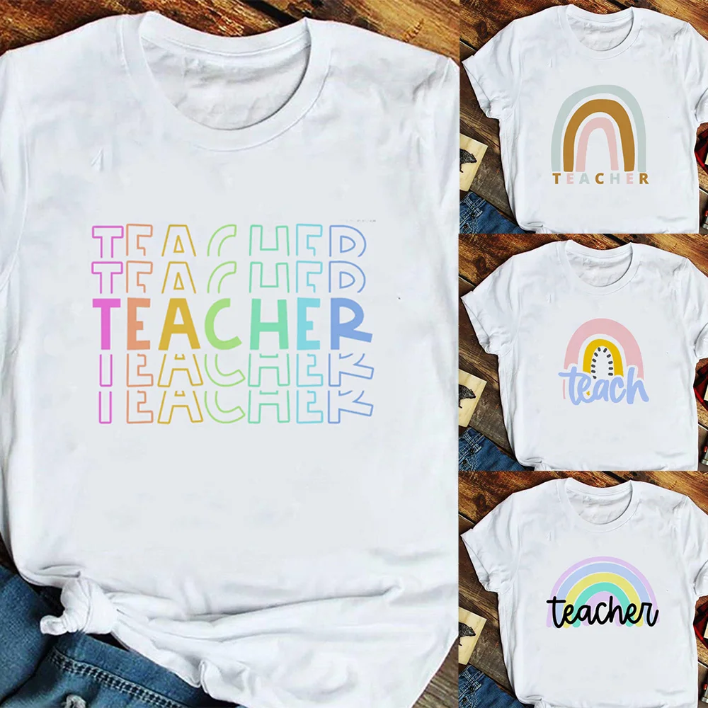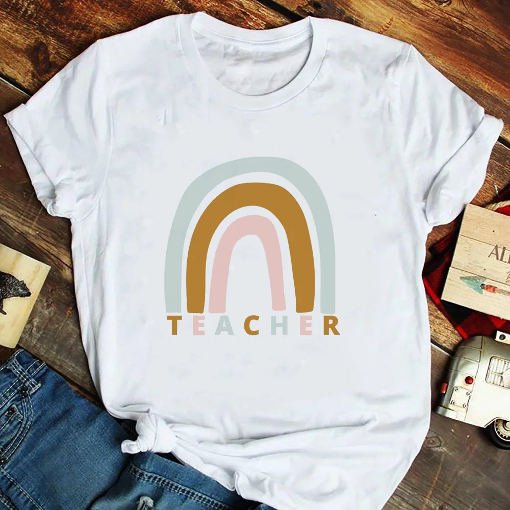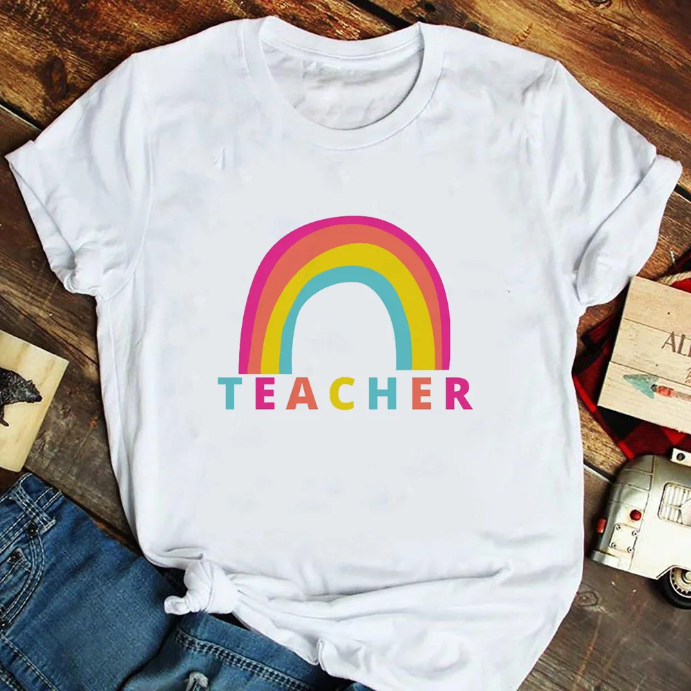 Женская футболка с радужным принтом, повседневные футболки с коротким рукавом Harajuku, Женская белая футболка Kawaii Teach Camisetas