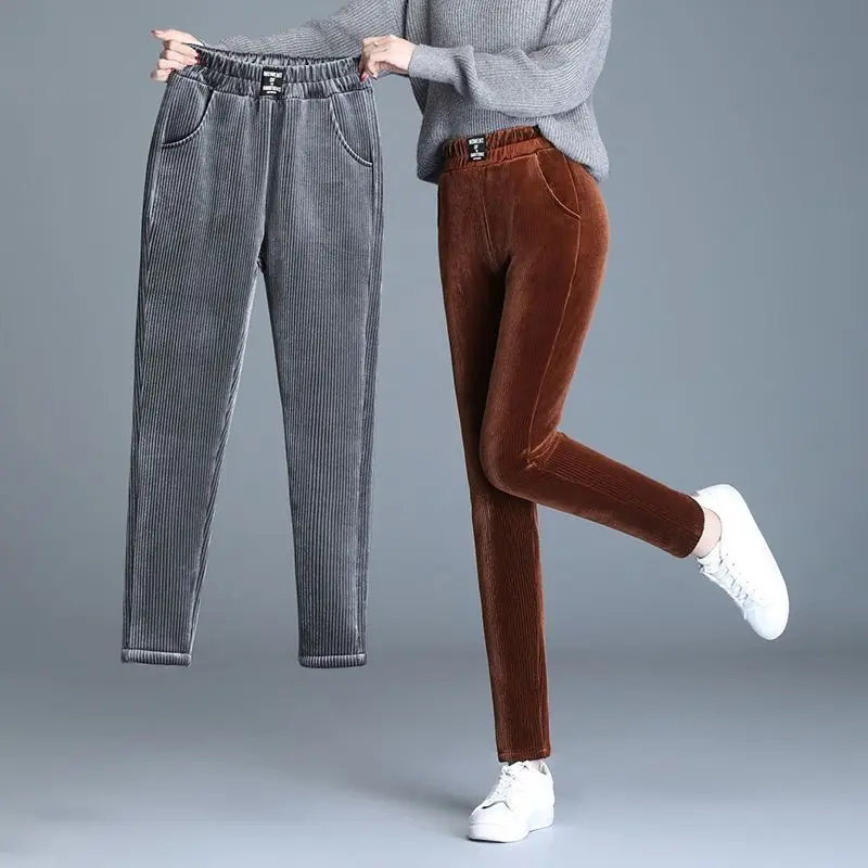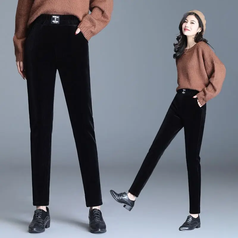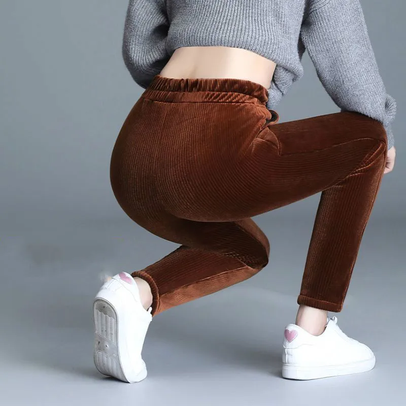 Брюки женские вельветовые с подкладкой, модные эластичные штаны с завышенной талией, простые однотонные шаровары из овечьей шерсти, зима 2020