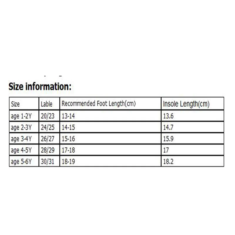 Уважаемый клиент:Поскольку в каждой стране имеется разная этикетка размеров, поэтому выберите правильный размер, необходимо измерить длину стопы ребенка, проверьте информацию о размере.К примеру: ребенка длиной 11,0 см, мы рекомендуем вам выбрать длину стельки-12,0 см., потому что нужно предоставить Носки 1 см свободного пространства.Если у вас есть какие-либо вопросы, пожалуйста, отправьте сообщение, мы поможем вам