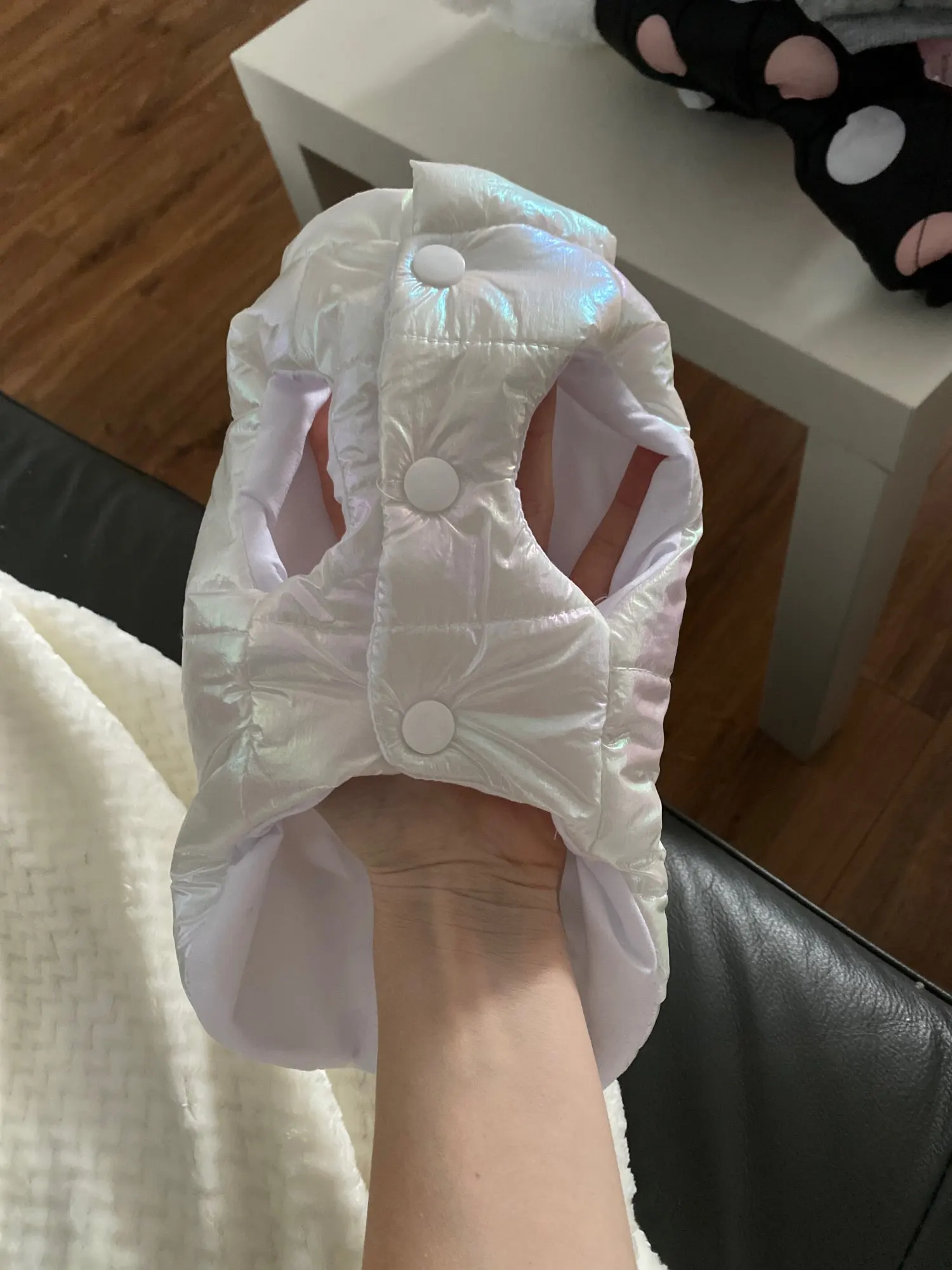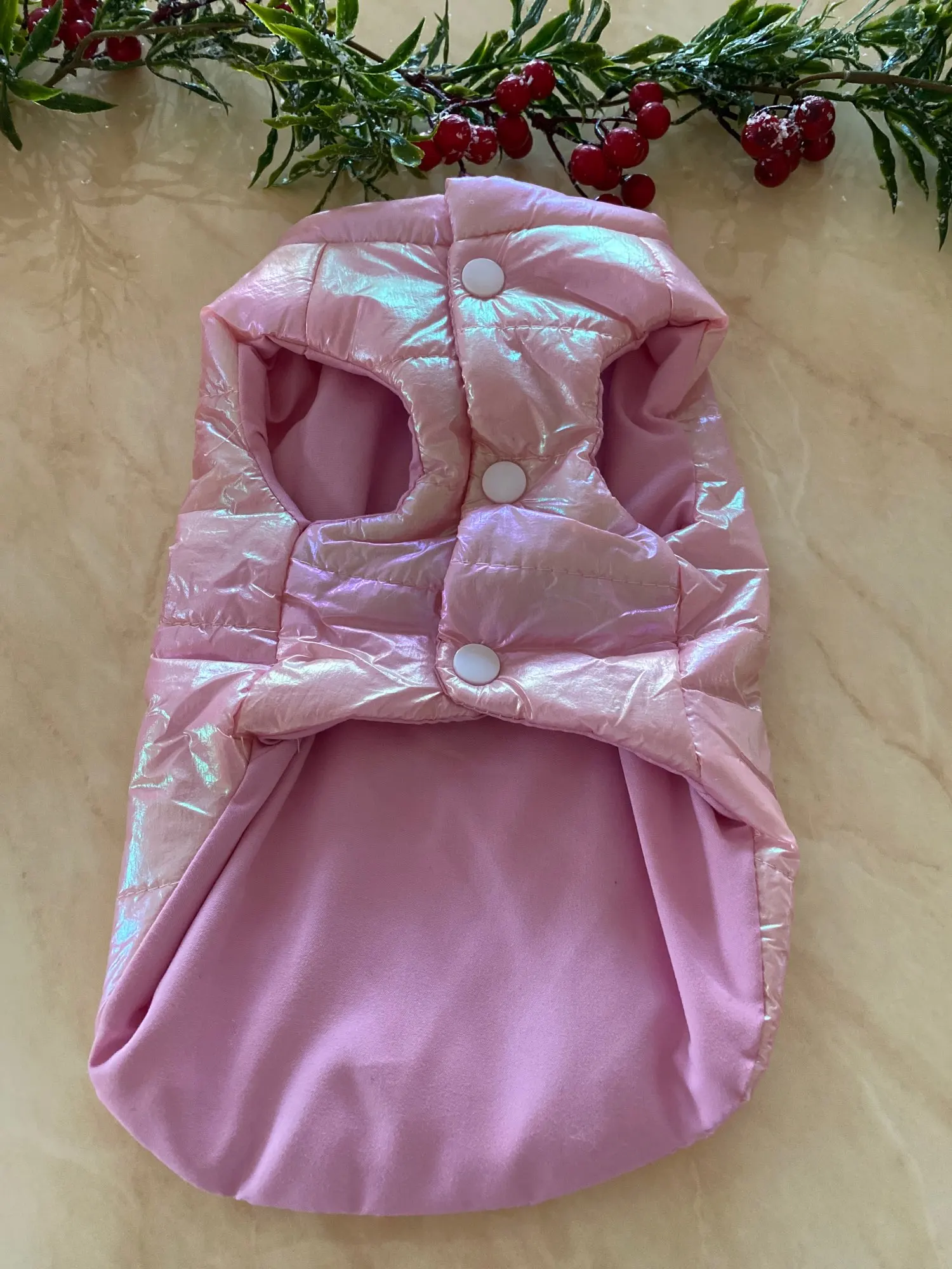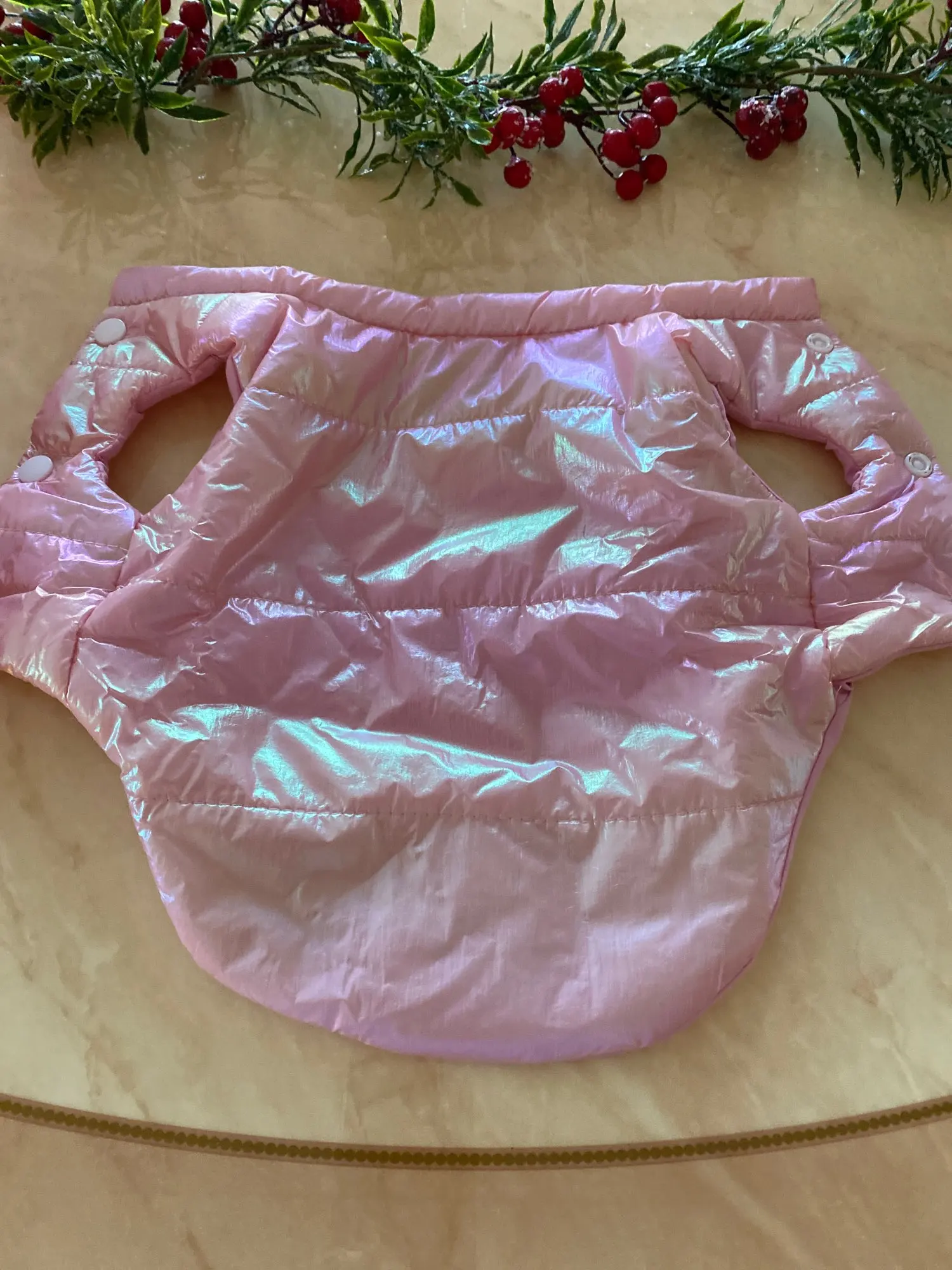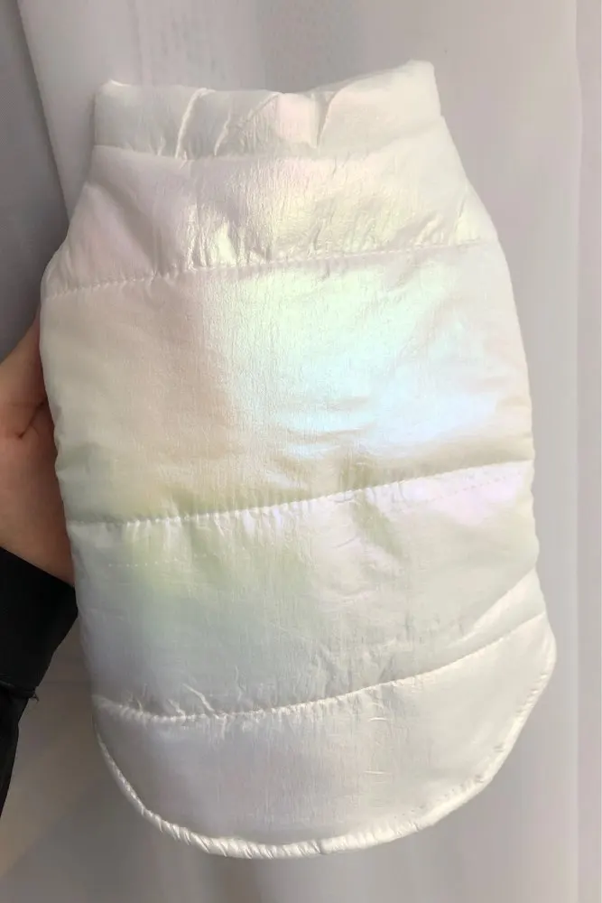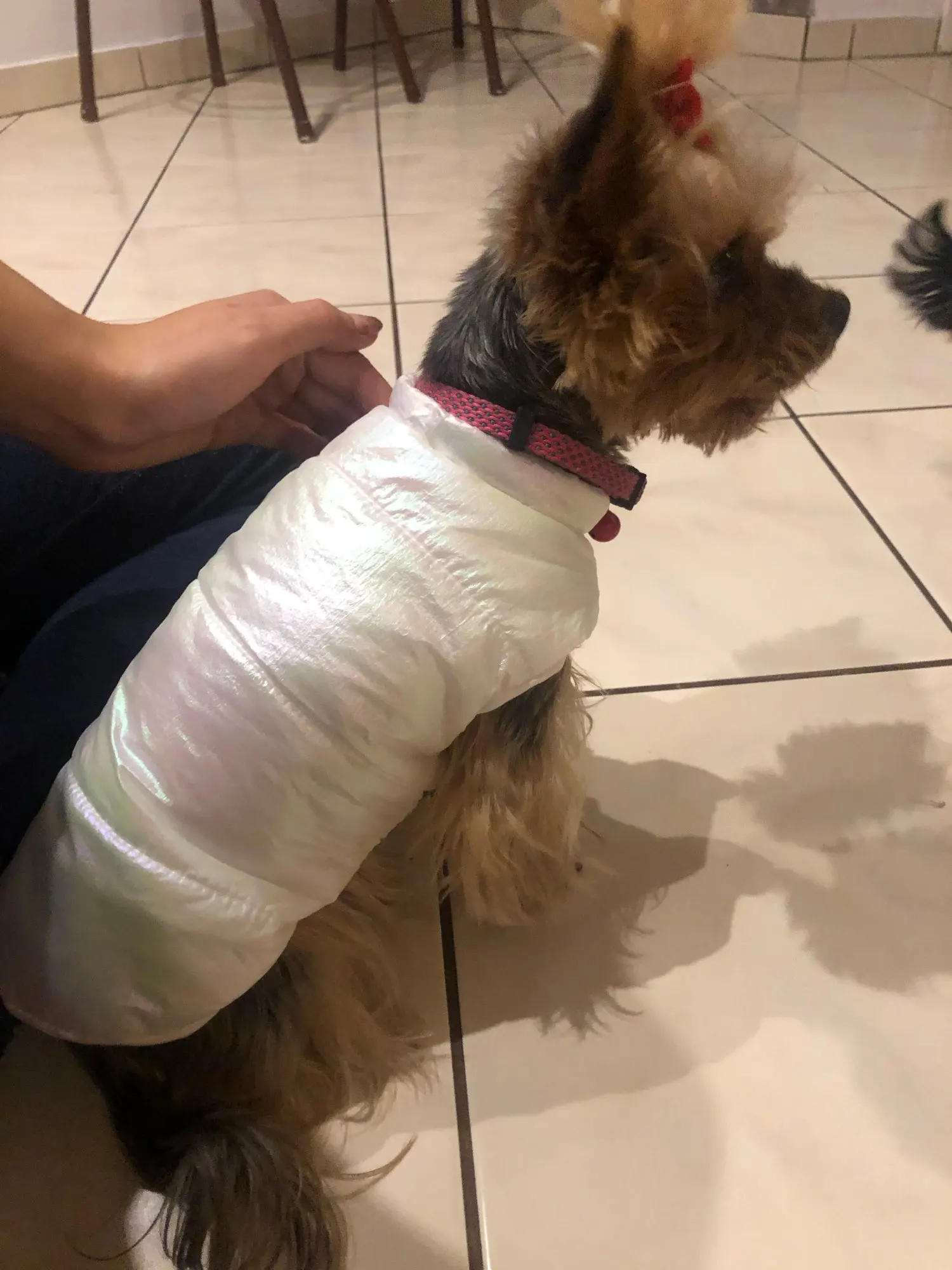 Посилку отримала! Цілком задоволена, але є нюанси , курточка прийшла гарна, з тим відтінком , що і хотіла , розмір добре підібрала, на собаку йорка 3 кг( взяла М ) і не проградала. Але де закльопки є нерівно прибиті закльопки, одна вище друга нижчи відповідно утворюється невеличка дирка між закльопками. Але за ці гроші -вартує! Бо знизу цього при носці не видно! Тому покупкою у будь якому разі, задоволена і рекомендую.