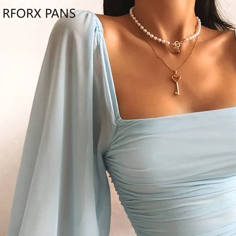 Женское однотонное облегающее платье с рукавами-фонариками и рюшами, Повседневное платье, элегантное вечернее платье