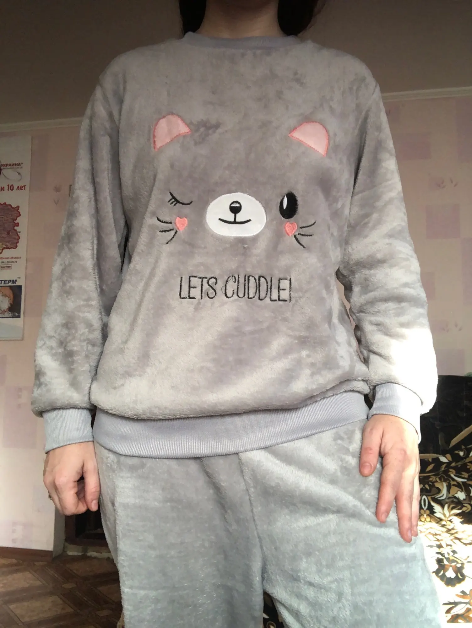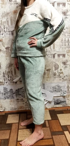 Мягкий и тёплый костюм Мой рост 160, резинку нятянула на талию из-за этого штаны короткие, если резинку ниже опустьть, то будут выше щиколотки. Для меня не много коротковаты, а на человека в 170 ростом, так вообще как бриджи. Я на 4 месяце беременности и резинка тугая, но этот костюм изначально не для беременности.