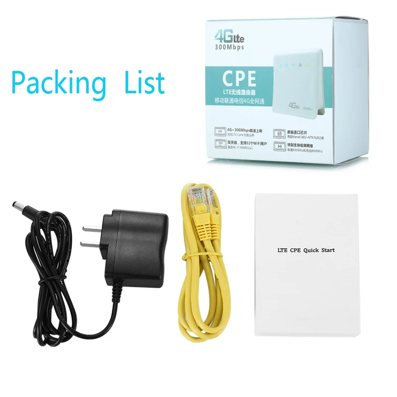 Поддерживает диапазон FDD B1 B3 B5 B7 B8 B20 Поддержка браслета TDD B38 B39 B40 B41 Поддержка WCDMA: B1 B5 B8 Предоставьте кнопку ручного сброса для восстановления заводских настроек по умолчанию. Расстояние передачи данных: В помещении 30 метров насколько; На улице до 100 метров (из-за различных условий окружающей среды) Температурный диапазон от-10 до 50 ℃ эксплуатации; От-20 до 70 ℃ хранения Размер: 200 мм x 145 мм x 48 мм Источник питания постоянного тока 12 В 1 А Оператор может посетить веб-сайт http:// 192.168.100.1 для настройки устройства. Обратите внимание, что пароль пользователя по умолчанию-админ