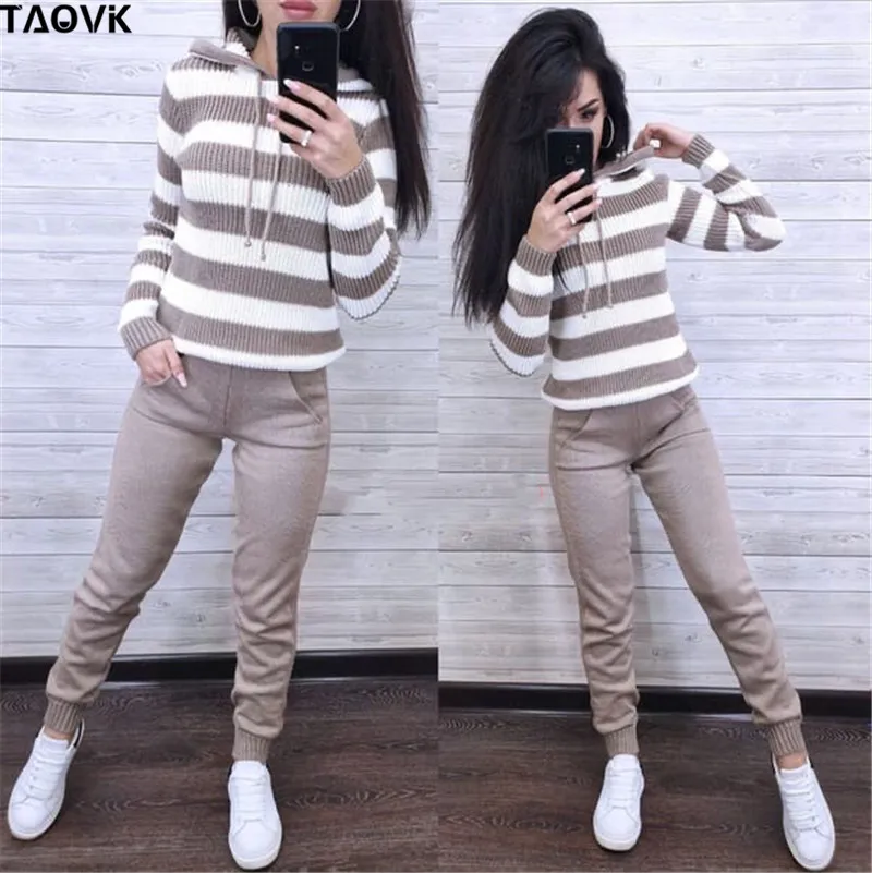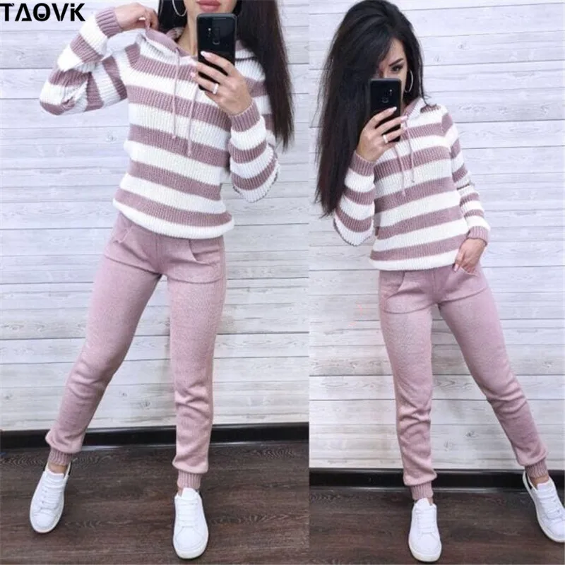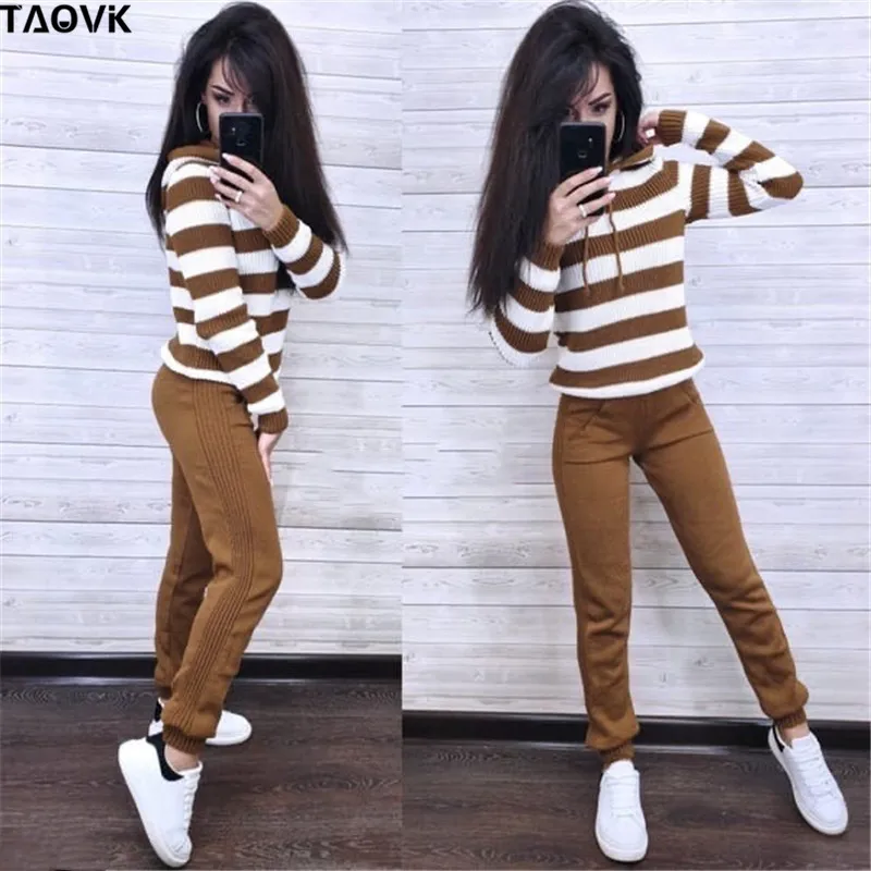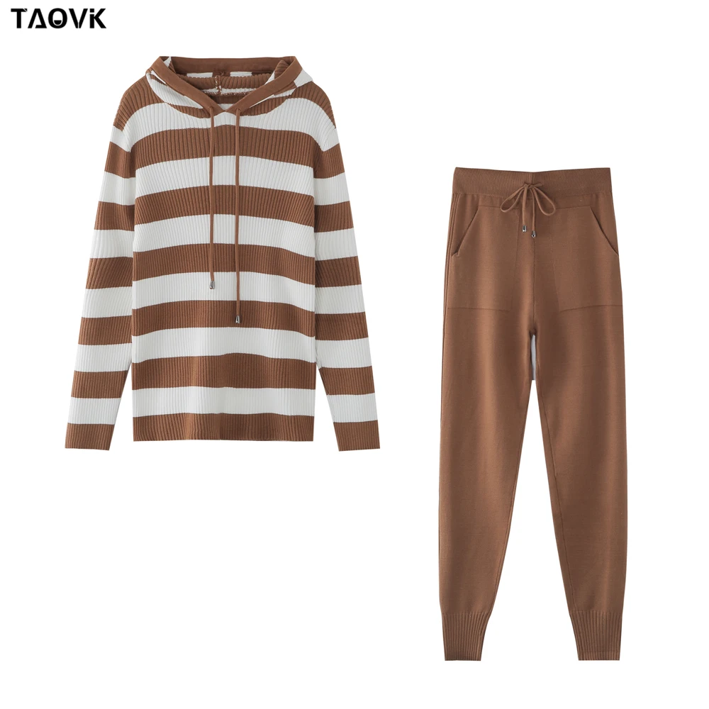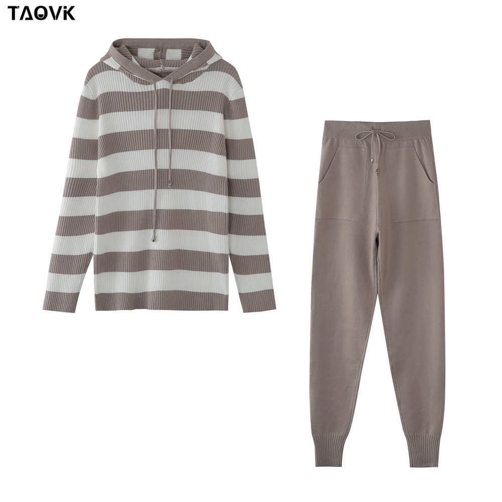 Женский вязаный спортивный костюм TAOVK, свитер с капюшоном и брюки, комплект из двух предметов