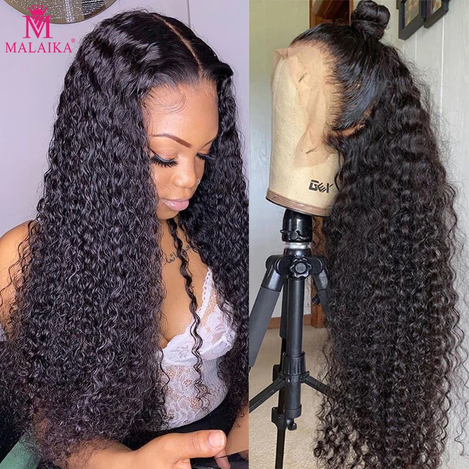 Malaika глубокая волна перуанские Синтетические волосы на кружеве парики из натуральных волос на кружевной предварительно Курчавые Волнистые фронтальной парик вьющиеся волосы пряди парик