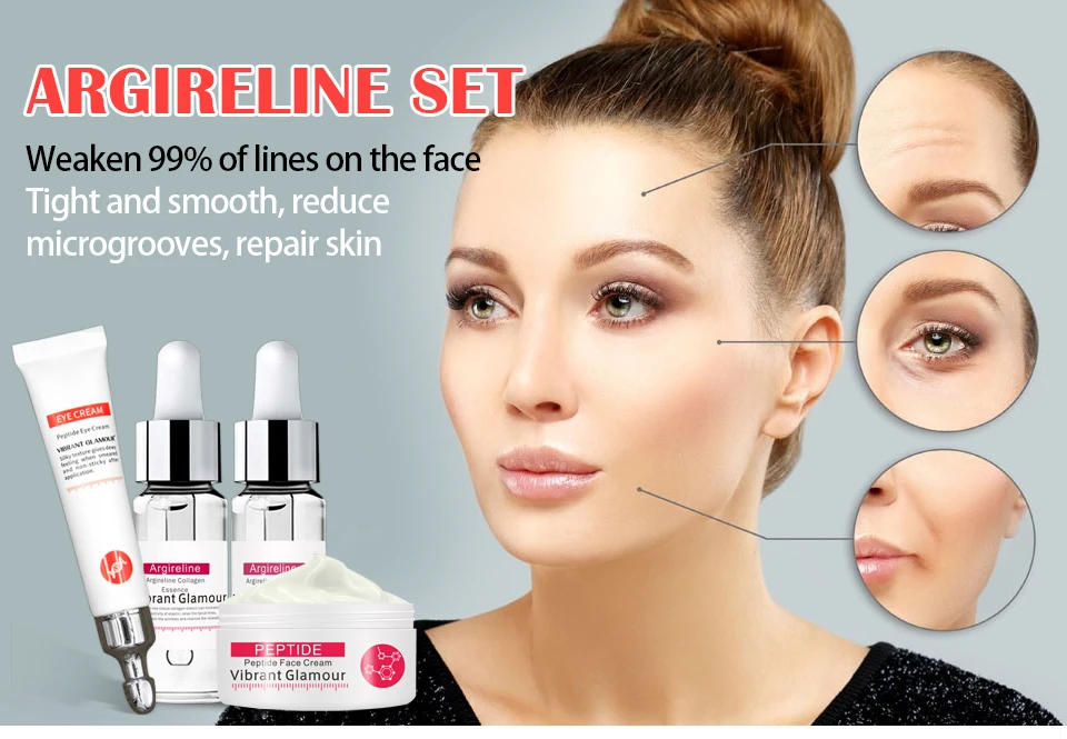 1.[название продукта]: Крем Сыворотка для глаз эссенция крем для глаз, набор для ухода за кожей 2.[Чистый вес]:4 шт. 3.[Основные ингредиенты]: Аргирелин, гиалуроновая кислота 4.[особенность]: Отбеливающее бледное пятно, укрепляющее против морщин. 5.[Тип]: подходит для всех типов кожи, укрепляющий набор против морщин, набор для ухода за кожей 6.[Эффект]: коллагеновая сыворотка, аргирелин, эссенция для лица, увлажняющая эссенция лица 7.[Преимущества]: отбеливающий набор, крем для лица от морщин, эссенция для лица 8.[ДЕТАЛИ]: защита от отечности, темных кругов, удаление мешков для глаз, защита от отечности 9.[Использование]: Сравнение до и после использования A. Уменьшает морщины на лице, микропазы на глаза, морщинки на лбу, носогубные морщинки и морщинки на шее, улучшает содержание воды в коже, позволяет коже быть более тонкой и гладкой B. Улучшает шероховатость кожи на лице, а также отверстия и различные микропазы, вызванные ослабленной способностью восстановления кожи из-за оттока коллагенового белка