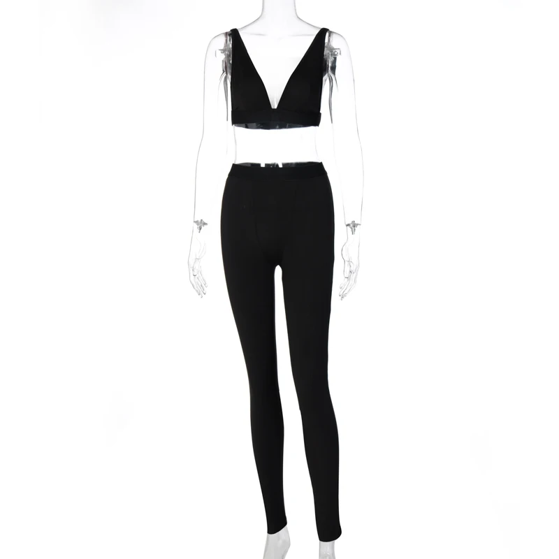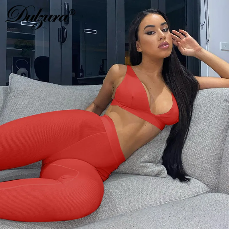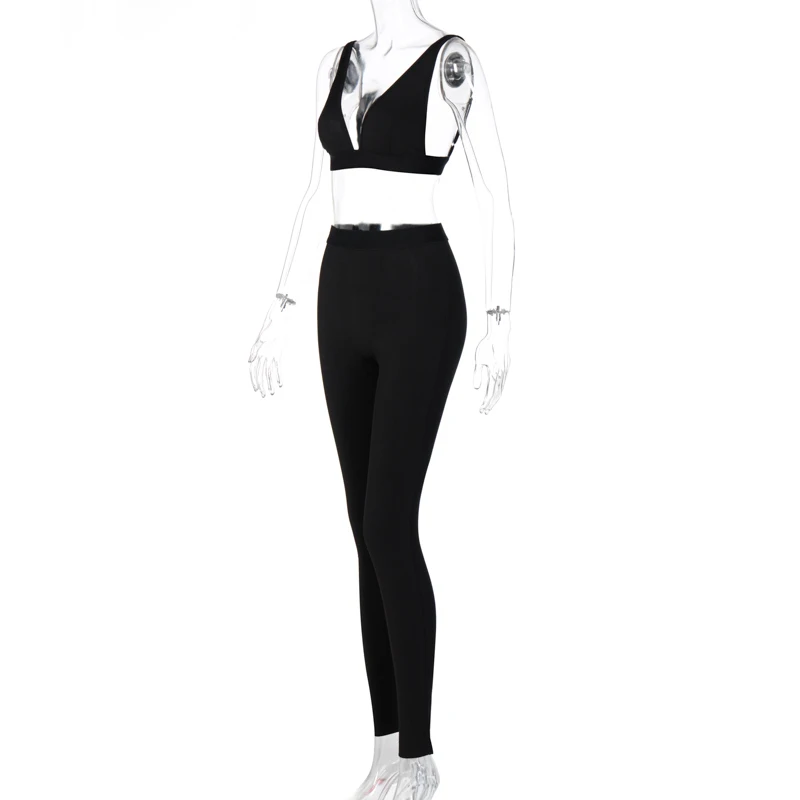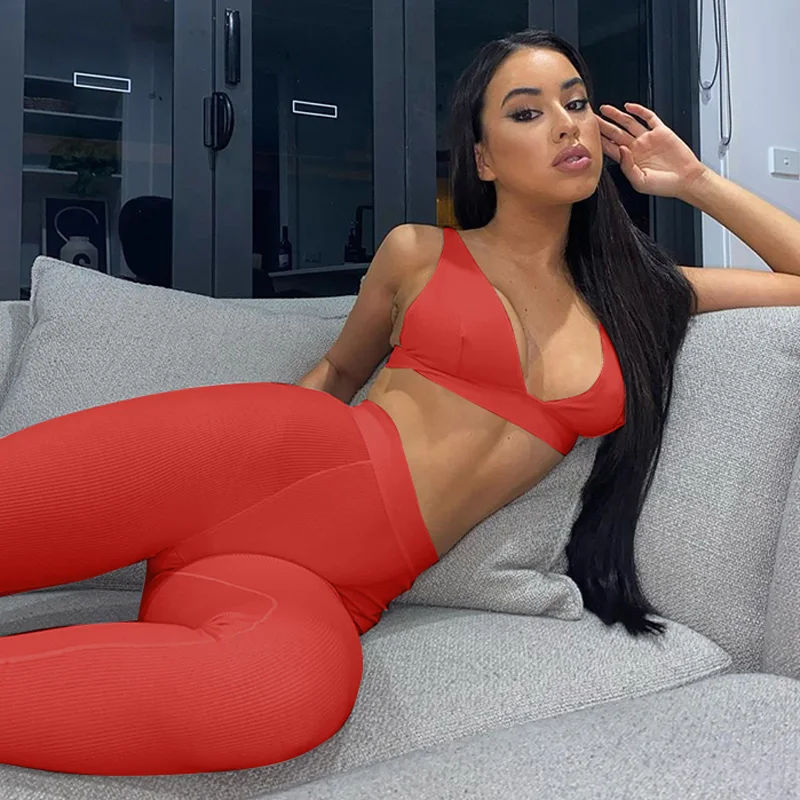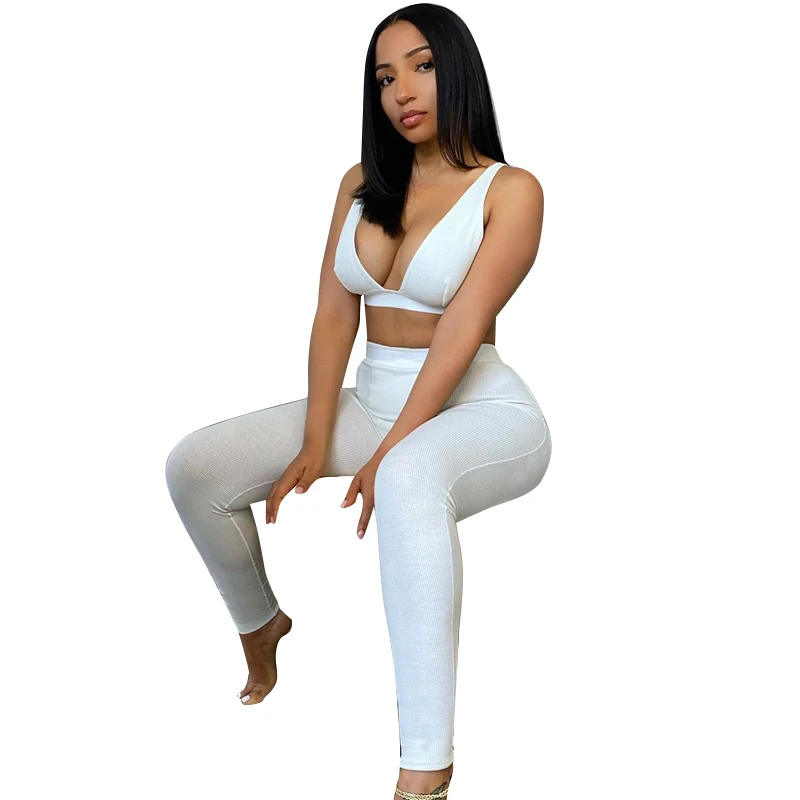 Комплект женский из 2 предметов, короткий топ и леггинсы, в рубчик, с V-образным вырезом, Осень-зима 2020