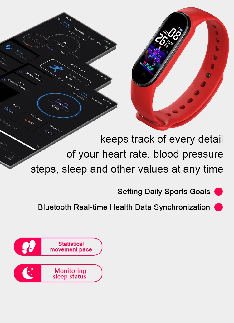 Спецификация:Тип: Смарт-часы M5Материал: ТПУ, АБС-пластик, поликарбонатСистемные требования: подходит для Android 5,0/IOS 9,0 или выше0,96 дюймовый цветной экран IPSУпражнения и здоровье: Синхронизация информации, качество сна, шаги, расстояние, калории, IP65 пылезащитный и водонепроницаемый, многоязычный, может управлять камерой телефона.Поддержка динамического сердечного ритма, кровяного давления, контроля уровня кислорода в крови.Поддержка напоминания о звонках и напоминания о сообщенияхПожизненный водонепроницаемый: IP65, вы можете мыть руки и носить его под дождем, но лучше не плавать.Ремешок для браслета заменяется.Напоминание: перед первым использованием убедитесь, что браслет полностью заряжен. Если аккумулятора недостаточно для запуска, пожалуйста, заряжайте его не менее 3-5 часов.Посылка включает в себя:Умные часы-1 шт.Кабель зарядного устройства-1 шт.1 x Руководство пользователяПримечание:Из-за разницы в настройках монитора и световых эффектов фактический цвет может немного отличаться от цвета на картинке.Это наш собственный браслет M5. Умные браслеты не подходят для медицинского использования, пожалуйста, не покупайте, чтобы проверить их здоровье (проблемы с сердцем, проблемы с кровяным давлением), не подходит для профессионального использования, только для справки