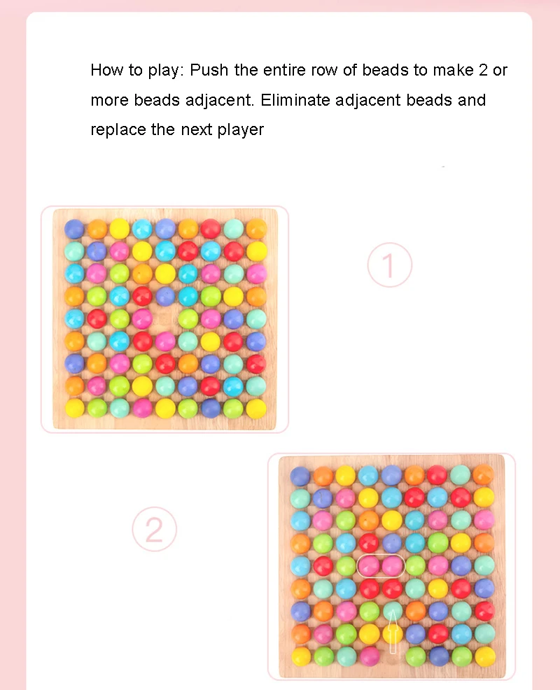 1. Поместите бусины в паз и обратите внимание на различные цвета в прилегающих положениях. Необходимо в середине нижней пластины (свободные 2-3 положения, чтобы облегчить движение).2. Перемещайте бусины таким образом, чтобы бусины одного и того же цвета были прилегающими, а бусины одного и того же цвета были вывезены и принадлежали плееру.Способствует взаимодействию родителей и детей, очень интересные игрушки.