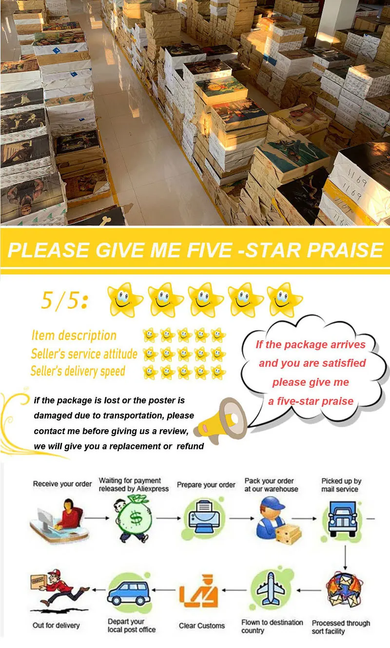 1. Если продукт, который вы получили, поврежден во время транспортировки, пожалуйста, не оставляйте нам плохой отзыв немедленно, вы можете связаться с нами, чтобы решить эту проблему. 2. Если ваше время подтверждения истекает, и вы все еще не получили товар, пожалуйста, свяжитесь с нами, мы продлим дату доставки как можно скорее. 3. Пожалуйста, не открывайте споры в течение 60 дней. Если вы все еще не получили товар через 65 дней, пожалуйста, свяжитесь с нами, чтобы решить эту проблему. Информация о продукте: 1. Материал: 150 г ретро крафт-бумага, без покрытия, не водонепроницаемая 2. Цвет: постеры 100% реальности, но из-за разного отображения изображения реальности цвет difterence, поэтому, скорее всего, получите плакаты, и вы увидите, что фотографии в цвете отличаются. Фактический относительный дисплей плаката будет слегка желтоватым 3. Погрешность в 1-2 см, измеренная вручную, находится в пределах нормального диапазона.