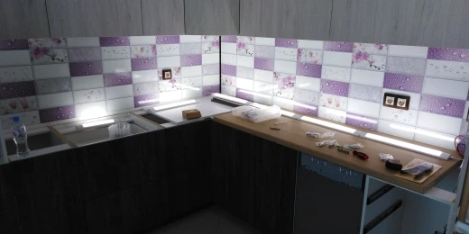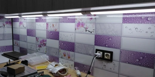 Блестит очень ярко, не мерцает, не нагревается. Рекомендую. Большое спасибо за ваши услуги. Моя кухня просто идеальна