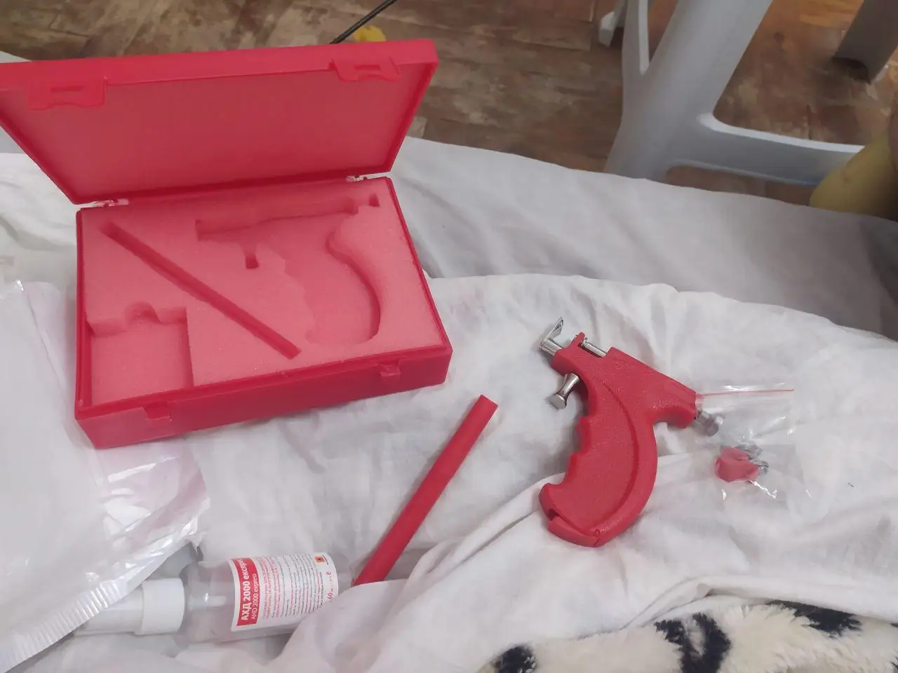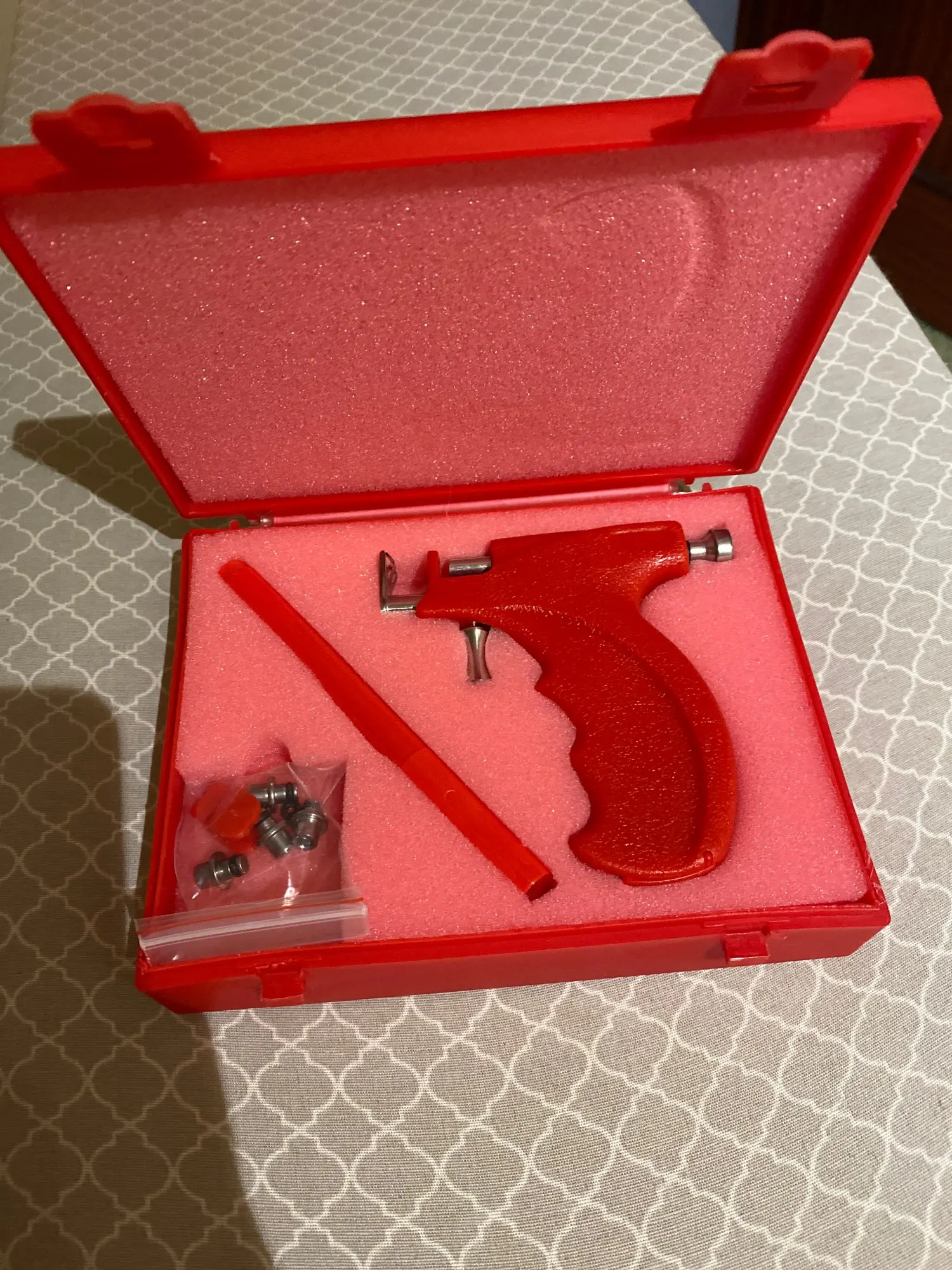 пистолет отличного качества! тяжелый, удобный :)) хорошая упаковка и чемодан)) к пистолету в комплекте насадки для разного диаметра гвоздиков (медиц.пусетов) и фломастер. пробила мужу ухо (показываю фото) - сказал, что небольно совсем :)) продавец хороший, быстрая, беспроблемная доставка)))