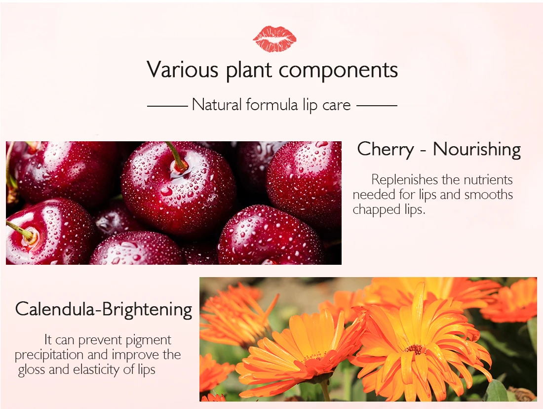 Сочетание богатых увлажняющих вишен и растений календулы сочетает в себе пленку для губ, которая питает губы, смягчает губы и оставляет тусклые и гладкие линии и улучшает тонкие линии. Гель-растительная эссенция может мягко управлять кератином, мягко удалять омертвевшую кожу, таять глубоко, питает и поднимает вишневые гладкие губы.