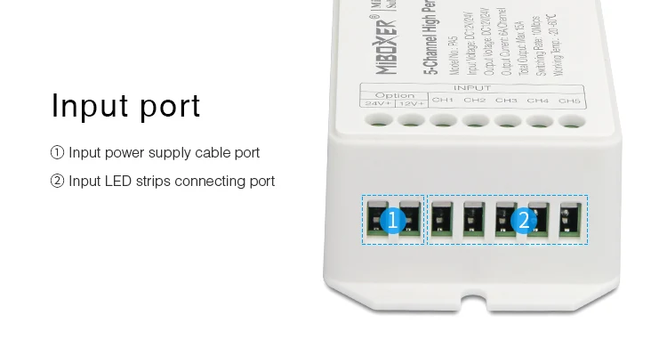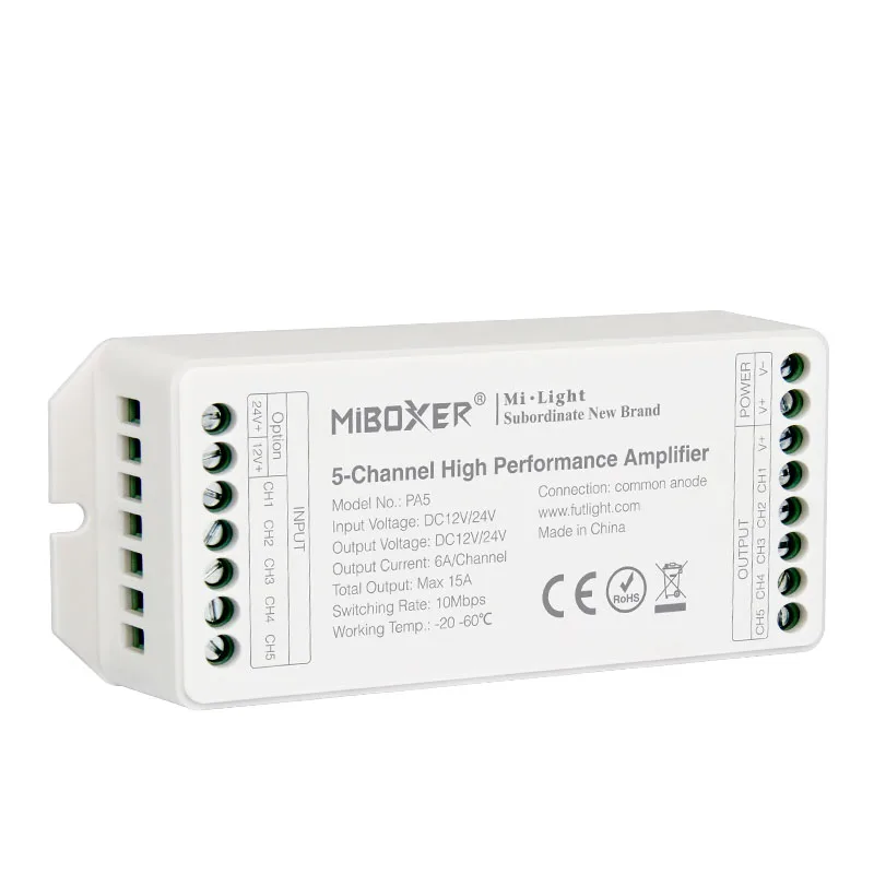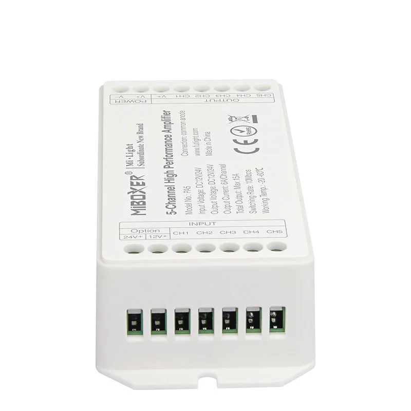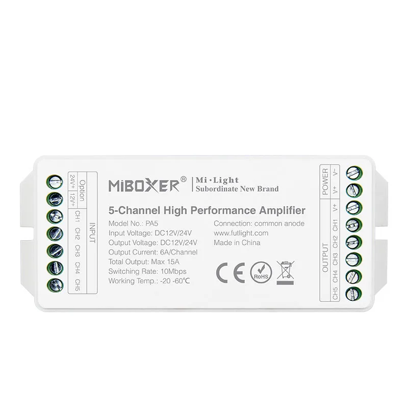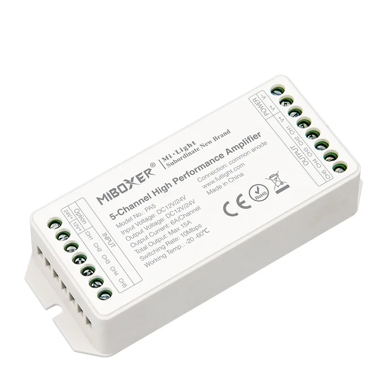 Параметры продукта Название продукта: 5-канальный высокоскоростной Усилитель Номер модели: PA5 Рабочая температура: -20 ~ 60 °C Входное напряжение: DC12-24V Выходное напряжение: DC12-24V Выходной ток: 6А/канал Общий выход Макс: 15а Выходная мощность: 12 В <180 Вт, 24 В <360 Вт Скорость переключения: 10 Мбит/с Подключение: общий анод