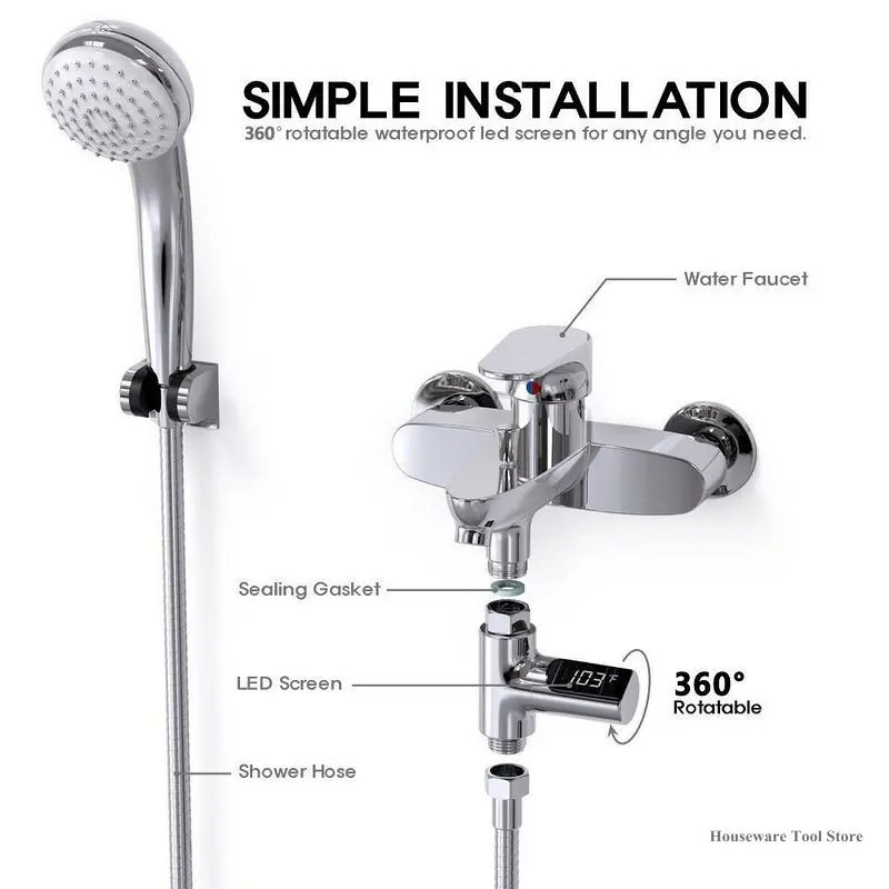 Вращающийся на 360 градусов Водонепроницаемый светодиодный экран для лучшего просмотра. Совместим с большинством душевых принадлежностей, легко устанавливается без каких-либо инструментов.