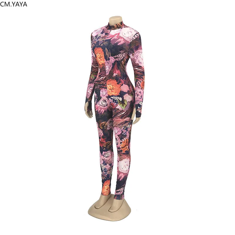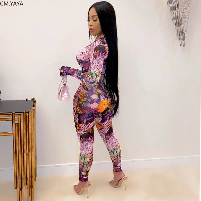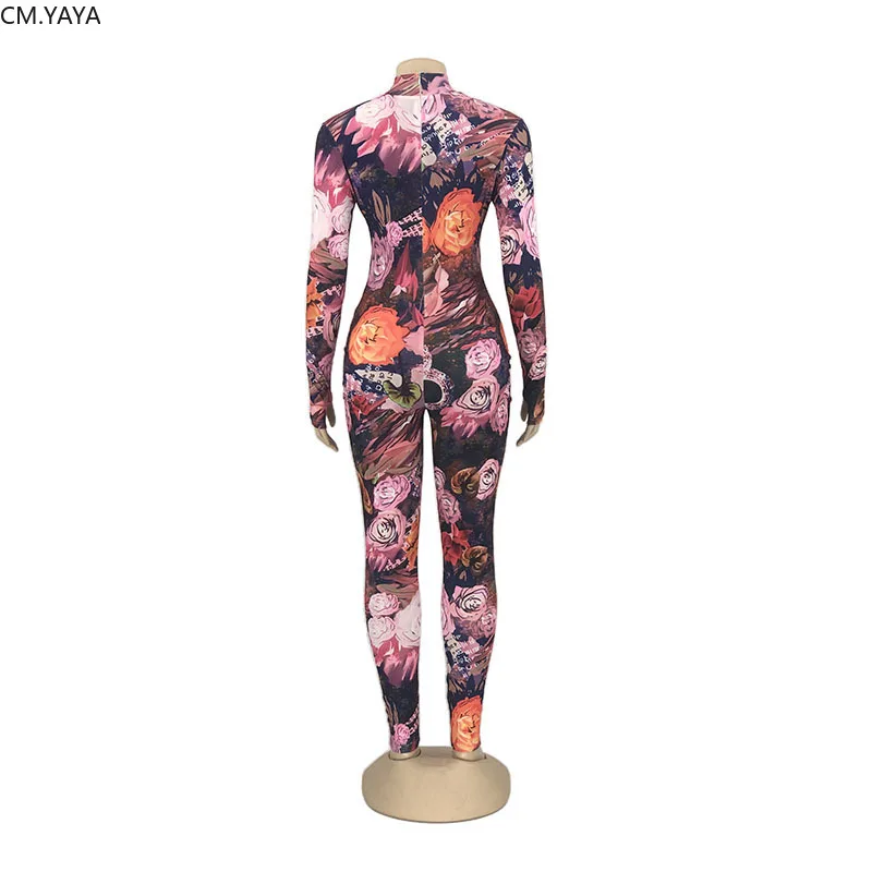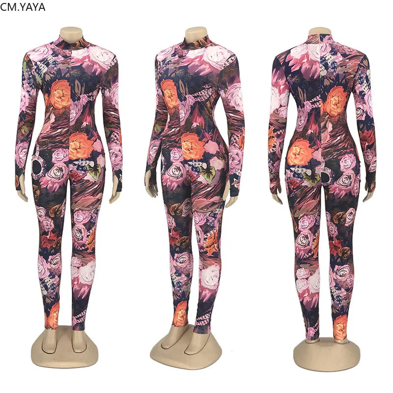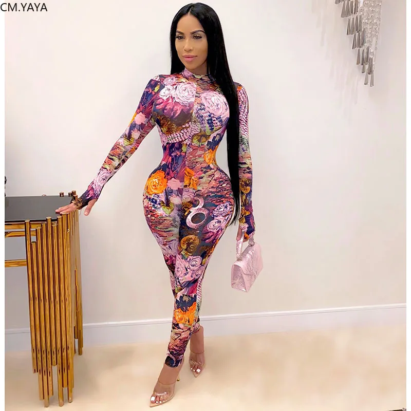 См. Несокрушимая Механическая тренировки Винтаж Цветочный принт комбинезон Для женщин комбинезон с длинным рукавом пикантные Клубные вечерние Фитнес Bodycon обтягивающие джинсы комбинезоны