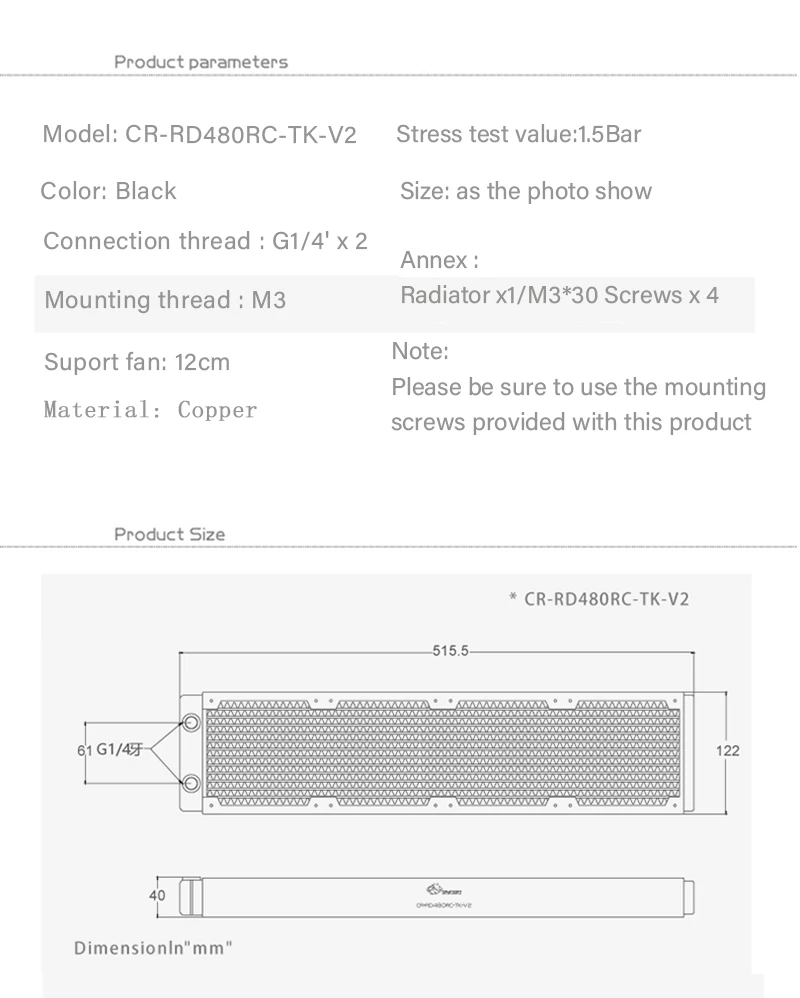 Радиатор выглядит очень хорошо. Хорошо упакованы. На коробке нет номера детали, поэтому сначала посмотрите, не могу ли я сказать, CR-RD480RC-TK-V2 или более старую версию. После распаковки вы можете увидеть логотип сбоку и номер детали. После дальнейшего осмотра я обнаружил, что некоторые ребра (те, которые ближе к краю) не контактируют с водопроводными каналами. Я предоставил изображение, чтобы вы могли это увидеть. Я думаю, что это будет иметь довольно небольшое влияние на производительность. Я думаю, что это то, как радиатор покинет фабрику, у него есть наклейка «качественная проверка» на коробке. Упаковка была в идеальном состоянии, поэтому я думаю, что радиатор покинет фабрику в этом состоянии. Доставка была очень длинной (заказал 23,11.2020; Получил 15.01.2021). Я еще не устанавливал контур водяного охлаждения, поэтому не могу сказать, протекает ли он или нет. В целом выглядит хорошо. Я предоставлю более подробную информацию, как только положу ее в свою систему. Очень хороший контакт с продавцом.