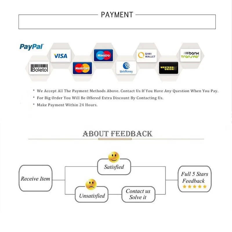 Возврат и возврат 1. У вас есть 7 дней, чтобы связаться с нами и 30 дней, чтобы вернуть его с даты получения. Если данный товар находится в вашем распоряжении более 7 дней, он считается пользованным товаром и МЫ НЕ ПРОИЗВОДИМ ВОЗВРАТ ИЛИ ЗАМЕНУ. Исключений нет! Стоимость доставки оплачивается как продавцом, так и покупателем пополам. 2. Все возвращенные товары должны быть в оригинальной упаковке, и вы должны предоставить нам номер отслеживания доставки, конкретную причину возврата. 3. Мы вернем вам полную сумму выигрышной заявки при получении товара в его первоначальном состоянии и упаковке со всеми компонентами и аксессуарами, после того как покупатель и продавец отменят сделку с aliexpress. Или вы можете выбрать замену.
