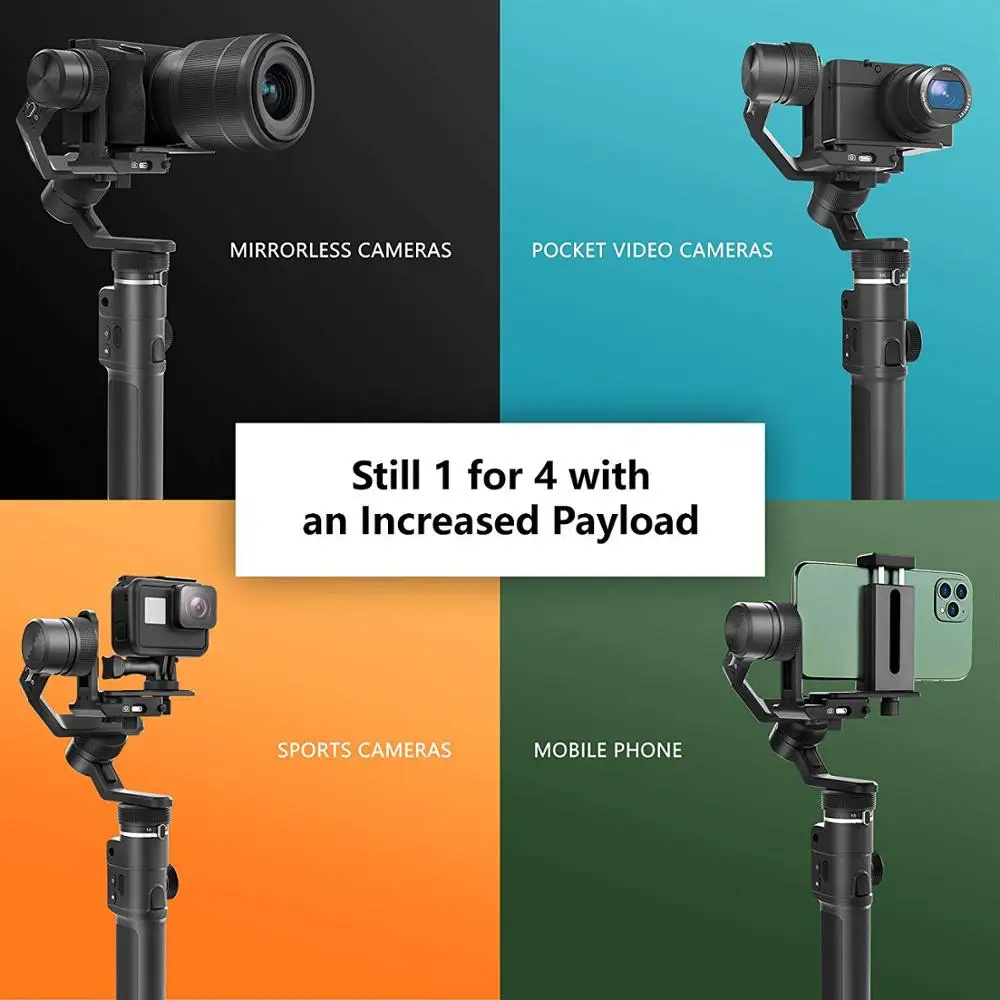 FeiyuTech G6 Max--- Все еще один для 4 с увеличенной полезной нагрузкой новый и улучшенный высокий крутящий момент, магнитные, бесщеточные двигатели могут похвастаться 50% увеличением выхода, что делает карданный шарнир совместимым с беззеркальными камерами, смартфонами, спортивные камеры и компактные камеры. В G6 Max может выдерживать до 1,2 кг, которые поддерживают сочетание нескольких камер и объективов для того, чтобы обеспечить более гибкое применение. Совместимость Камера/смартфон в стабильном Функция экшн-Камеры GoPro Hero 5/6/7/8 (Примечание: необходимо подключить GoPro зажим + T Тип адаптера, Т-образный adapteris стандартный аксессуар) sony RX100III / IV / V / VA /VI / M7 Series, a6000, a6300, a6400, a6500, a6600, a7M2, a7S II, a7 RII, A7S, a7R, a7, a5100, a5200, HDR-SR11E, HDR-CX270E, FDR-AS50, FDR-AS300, FDR-X3000R, ILCE-QX1, RX1R, NEX-5N, NEX-7, RX0, RX0 II Canon GX3, M50, g1X Mark II, G7X Mark II, G7X Mark III, EOS M, EOS M3, EOS M5, EOS M6,EOS M10, EOS M100, EOS 200D/ 200D II, EOS титановый Электролитный электрод со случайно выбранным Panasonic LX10, LX100 M2, Lumix DC-FT7, DC-ZS 70GK, DC-ZS220GK, DC-GF9XGK, DC-GF9KGK, DC-GF10KGK, DMC-ZS110, DMC-GX85, DMC-GX8, DMC-G2, GH4, G7, HC-V180 Nikon 1 J5 Leica D-lux FujiFilm X-A5, FujiFilm XT20 BlackMagic BMPCC первая версия смартфона: ширина смартфона должна быть 54-88mm.Like iPhone11,iPhone X,iPhone XR,iPhone Xs , iPhone XS Max,iPhone8,iPhone7Plus,iPhone 6s, HUAWEI P30, HUAWEI P20 Pro, HUAWEI P9,HUAWEI mate10, HUAWEI Honor V20, HUAWEI Honor 10, HUAWEI Nova4 , HUAWEI Nova 3e, MI 9,MI 8, Redmi 6 Pro, OPPO find X, OPPO R9s, Vivo NEX,Vivo X21, Vivo X23, Vivo X27,Vivo Y85, Samsung S10 +,Samsung Note 9,Samsung Note 8,Samsung Note 3, samsung S7,Smartisan Nut Pro2, One plus 3t, Google Pixel 3 и т. Д. Размер совместимой камеры s для справки: Высота камеры (включая высоту видоискателя) ≤ 105 мм расстояние от винтового отверстия до правого края камеры ≤ 87 мм Максимальная длина в направлении объектива: около 125 мм