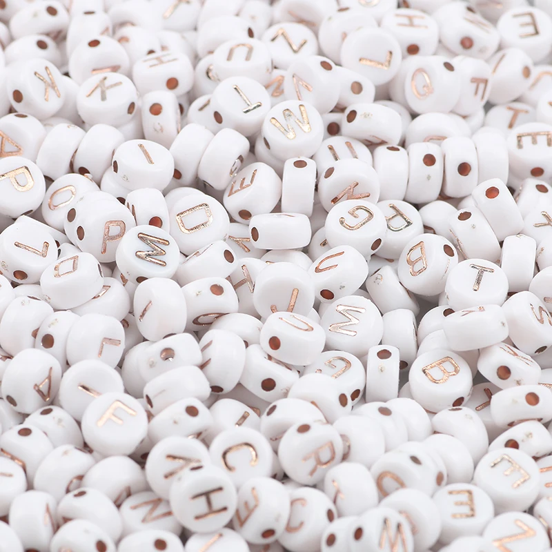 Имя:Смешанные акриловые бусины из розового золота с надписью, белый круглый плоский кубик алфавита, свободные бусины-разделители для браслета для изготовления украшений вручную «сделай сам»