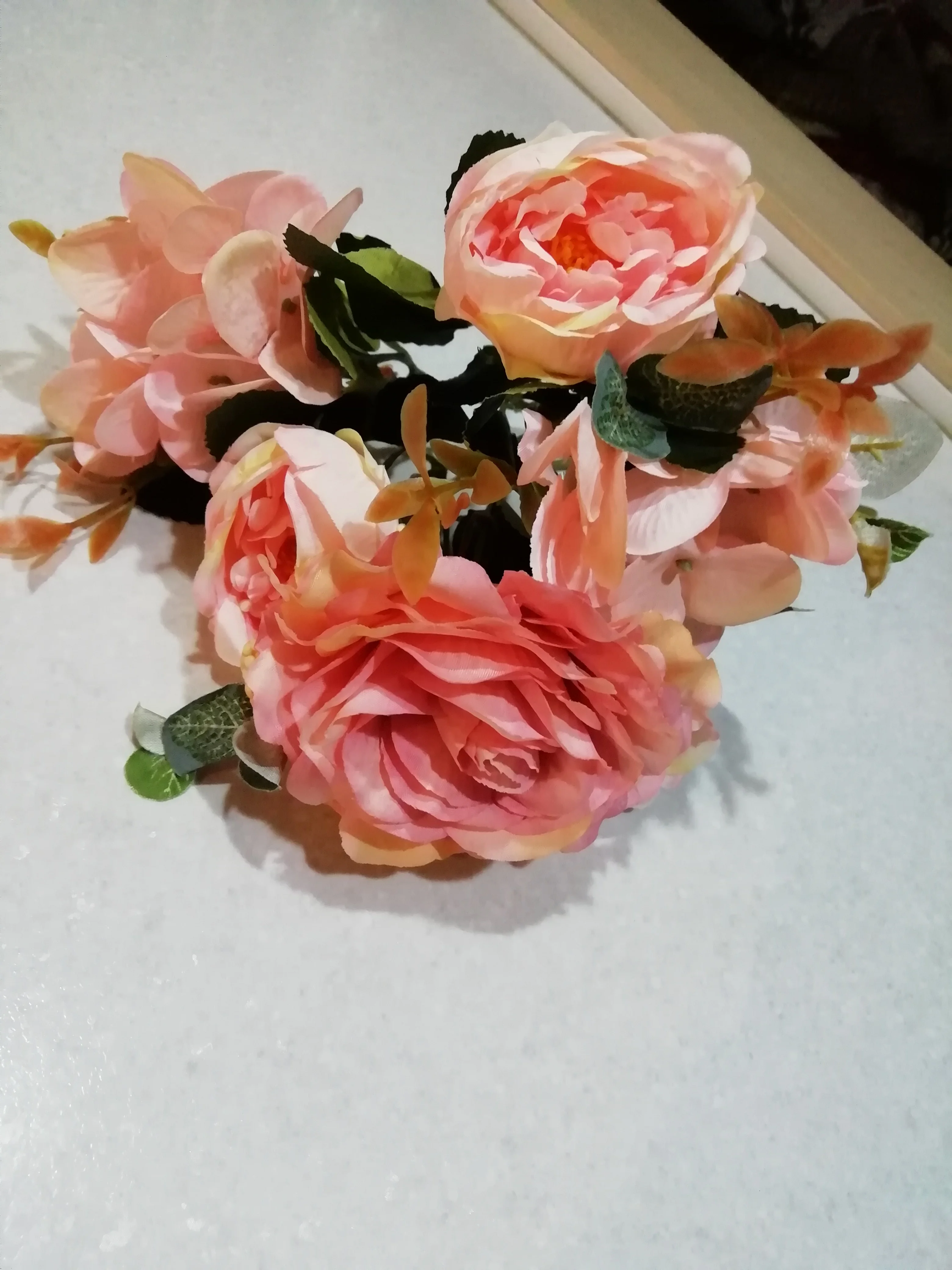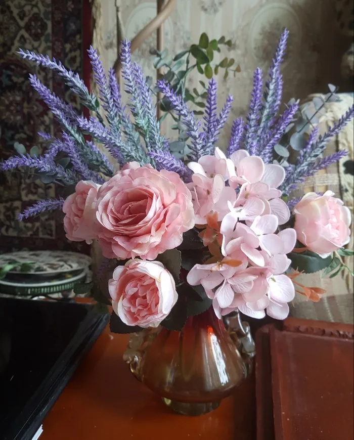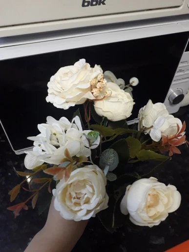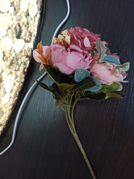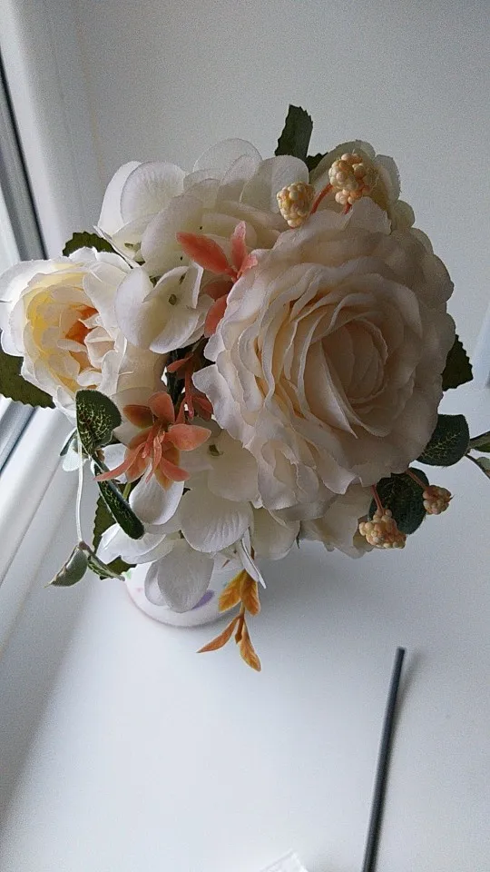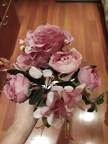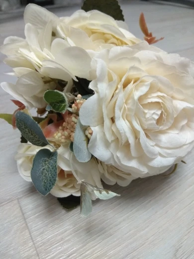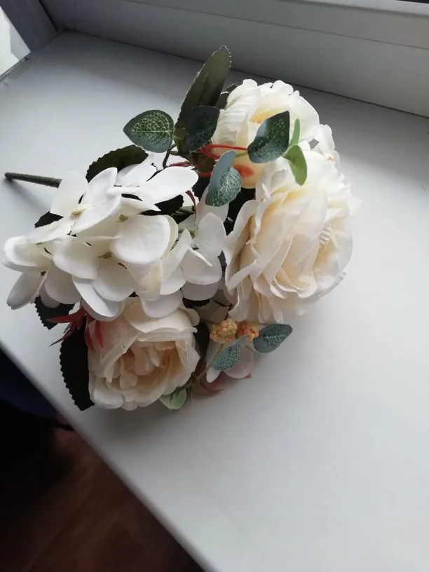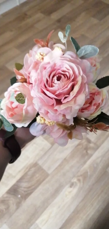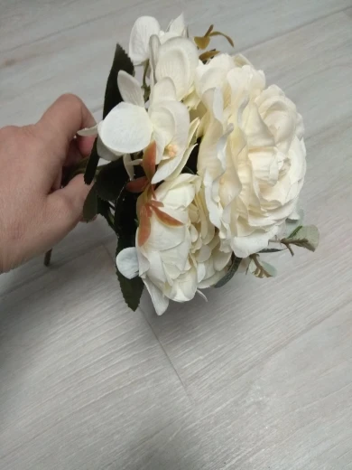 отличный букет! брала по купону, доставка 4 недели. в пути чуть помялся, выправляется легко, без запаха. розы и пионы в стиле шебби-шик реалистичны, стебли и листья пластиковые. недочёт один - слетают цветы гортензии, так очень понравился. товар и продавца рекомендую