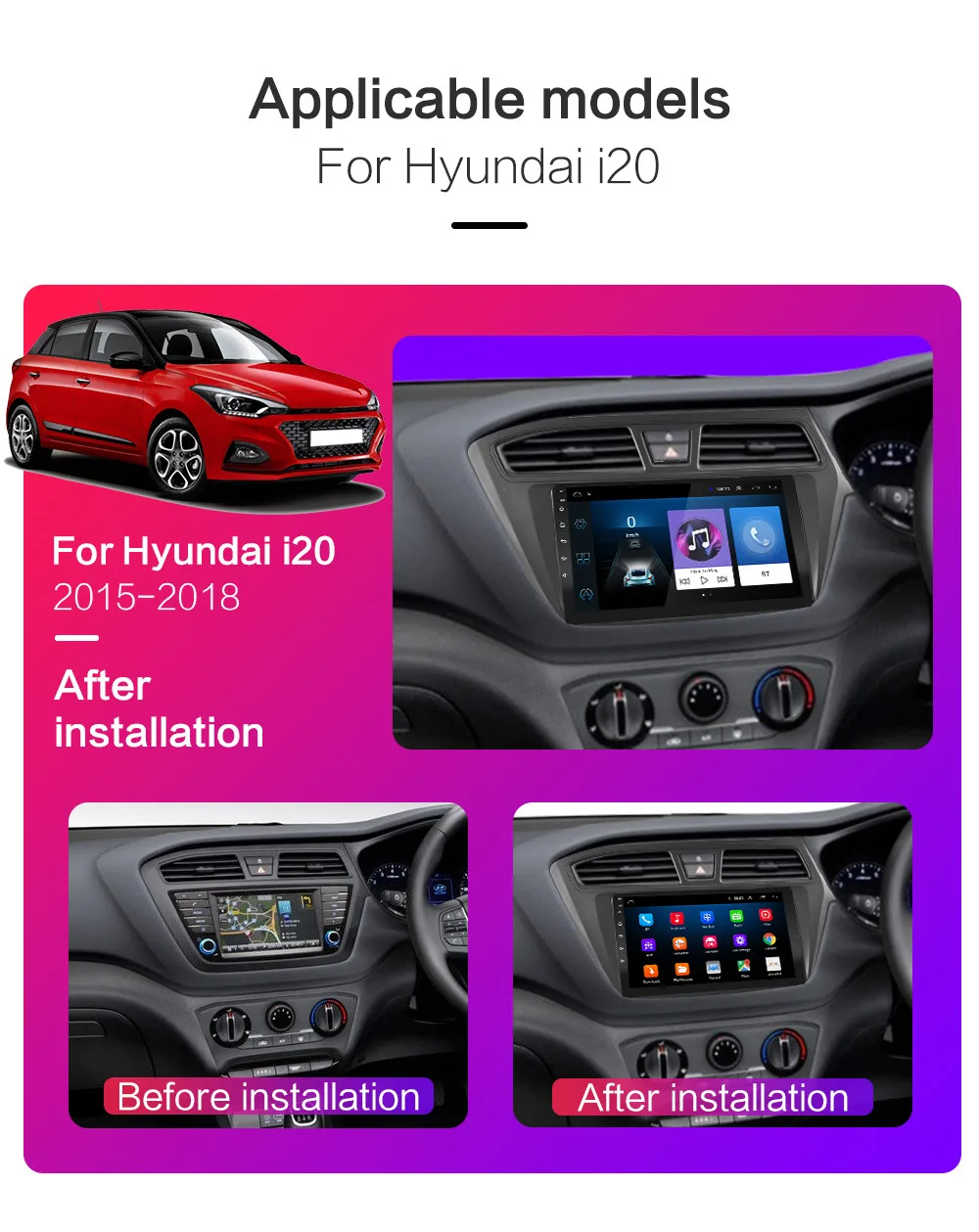 Для Hyundai I20 2015 2016 2017 20181, 4-х ядерный конфигурация включает в себя (Оперативная память + Встроенная память): 1 Гб + 16 ГБ/2 ГБ + 16 ГБ/2G + 32G / 4G-SIM-3560-2G + 32G [дополнительно]; 2, 8-ядерный конфигурация включает в себя (Оперативная память + Встроенная память): 7260L-2G + 32G / 7260L-4G + 64G / 4G-SIM-5760-2G + 32G / 4G-SIM-5760-4G + 64G / 4G-SIM-TS10-4G + 64G/4g-sim-ts6g на выбор + 128 3, 4-х ядерный содержит: версия: Android 8,1; Четырехъядерный процессор MTK8227 / Cortex-A7 Поддержка автомобиля logo5; Sfactory пароль: 8888 Разрешение: HD 2.5D,1024*600; Не поддерживает функцию AM, функцию RDS; Обычная посылка WiFi поддерживает функцию видеовыхода; Версия 3560-4G-SIM-WiFi: версия: Android 6,0; Поддерживает DSP; Не поддерживает функцию видеовыхода; 4, 8-Core содержат: версия: Android 9,0 или Android 10; Восемь ядер: CPU Quad core и GPU Quad core соответственно; Поддержка автомобиля logo5;Sfactory пароль: 8888; Разрешение: HD 2.5D,1024*600; Версия 7260L-WIFI: поддерживает функции DSP, сплит-экрана; Не поддерживает видеовыход; 4G-SIM-5760-WIFI и 4G-SIM-TS10-WIFI версия: поддерживает функции DSP, Carplay, сплит-экрана; Не поддерживает видеовыход; 5. Операционная система Android может установить приложение Google Play store Skype Facebook youTube Twitter и т. Д.; 6. Поддержка: радиостанция, Bluetooth Вызов, Bluetooth музыка, управление рулевым колесом, встроенный WiFi, MP3, видео музыка (MPG, AVI), навигация, видеовыход, зеркальная связь, USB 4G LTE WIFI ключ и другие функции; Поддержка OBD (опционально) Поддержка DAB + (опционально)