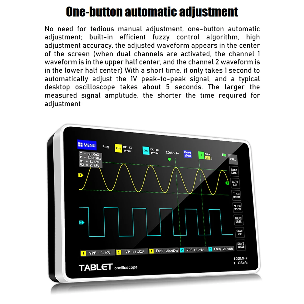 1013D-это полнофункциональный, высокопрактичный, экономичный двухканальный плоский осциллограф для обслуживания и R & D промышленности.Особенности:Интеллектуальная защита от ожогов, 1X Выдерживает напряжение до 400 В.100 МГц аналоговая полоса пропускания @ 1GSa/s частота дискретизации (1X = 5 МГц, 10X = 100 МГц).Полностью подходит для 7 дюймов 800*480 цветной TFT ЖК-дисплей с яркими цветами и высокой контрастностью.Емкостный сенсорный экран, такой же, как и Сенсорный режим современного мобильного планшета, не является резистивным сенсорным экраном с древней операцией ногтей.Диапазон высокого напряжения, 1x может измерить 0 ~ 40 В, 10x может измерить 0 ~ 400 В, 100x может измерить 0 ~ 4000 в.До 12 параметров измерения: VPP, VP, Vmax, Vmin, Vavg, Vrms, частые, Duty +, Duty-, Time +, Time-, Period.Функция измерения курсора, удобно вручную измерять период, частоту и напряжение.Полная функция запуска (одиночная, нормальная, автоматическая).В любое время дисплей формы волны (Функция паузы) заморожен.Оснащен высокой эффективностью одной кнопкой авто.Одна кнопка хранения сигналов и скриншот.Встроенная память объемом 1 ГБ позволяет хранить до 1000 скриншотов + 1000 наборов данных волноводной формы.Мощный Графический менеджер поддерживает просмотр эскизов, просмотр, Детальный просмотр, поворот страницы, удаление и масштабирование формы волны, масштабирование, перемещение и т. Д.Оснащен интерфейсом USB, который может быть подключен к компьютеру, чтобы поделиться скриншотами с компьютером, что удобно для вторичного анализа.Функция графического дисплея Lissajous может использоваться для определения амплитуды, частоты и фазового контраста двух групп сигналов.Функция отображения FFT, может анализировать Спектральные характеристики сигнала.Встроенный перезаряжаемый литиевый аккумулятор емкостью 6000 мАч, полностью заряжен в течение 4 часов непрерывного использования при максимальной яркости экрана.Технология сжатия памяти, экран обновления формы волны не мерцает.Регулировка яркости экрана.Ультратонкий, легко носить с собой.Характеристики:Материал: АБС-пластикЦвет: черный + белыйШирина аналогового ремешка: 100 МГц * 2Количество каналов: 2 каналаМаксимальная частота дискретизации в реальном времени: 1GSa/sВертикальная чувствительность: 50 мВ/див ~ 500 В/ДивГоризонтальный диапазон времени: 50S/div ~ 10NS/divМаксимальное тестовое напряжение: 40 В (1X зонд), 400 В (10X зонд)Глубина хранения: 240 кбитВходное сопротивление: 1 мТочность АЦП: 8 битРежим соединения: AC/DCРежим запуска: одиночный, нормальный, автоматическийКромка триггера: поднимающаяся кромка/опускающаяся кромкаНапряжение внешнего триггера: 0 ~ 40 вДисплей: 7 дюймов-800*480Работа: емкостный сенсорный экран + жестыУдлинительные порты: экспорт изображений USBИсточник питания: 1 * литиевая батарея, 6000 мАч (в комплекте)Размер изделия: 184*124*50 мм/7,2*4,9 * 2.0inРазмер посылка: 230*150*60 мм/9,1*5,9 * 2.4inПосылка Вес: 1000g / 2.2lbУпаковочный лист:1 * 1013D хост осциллографа2 * соответствующий зонд 100 МГц (1X и 10X)1 * usb-кабель для передачи данных1 * Руководство пользователя (на английском языке)