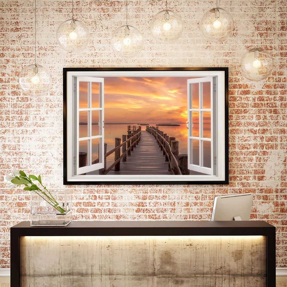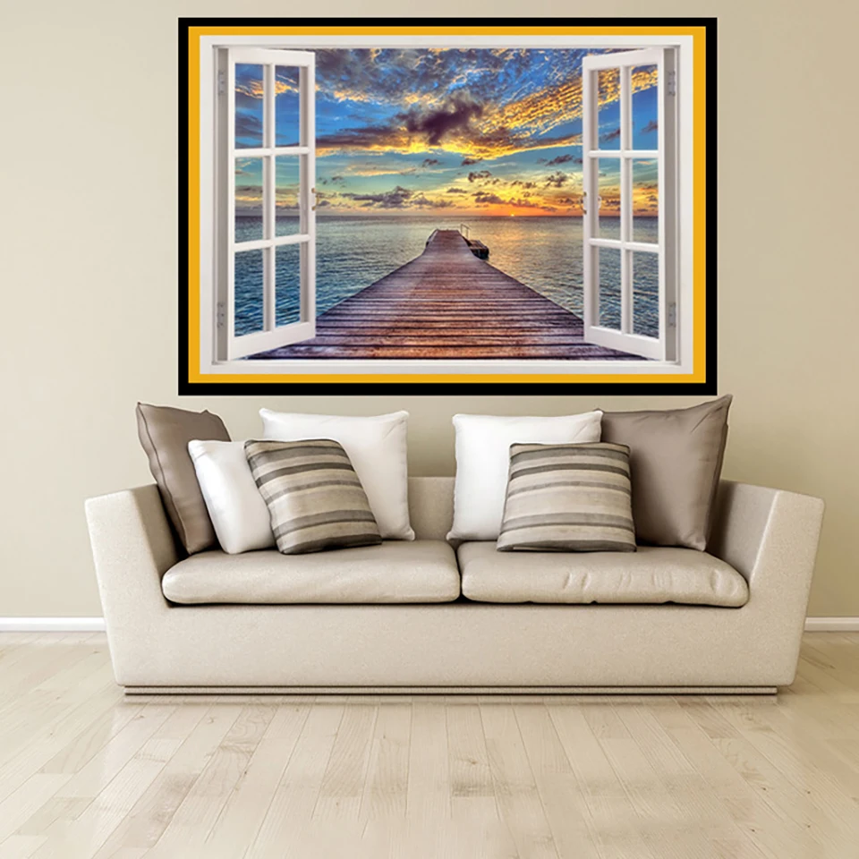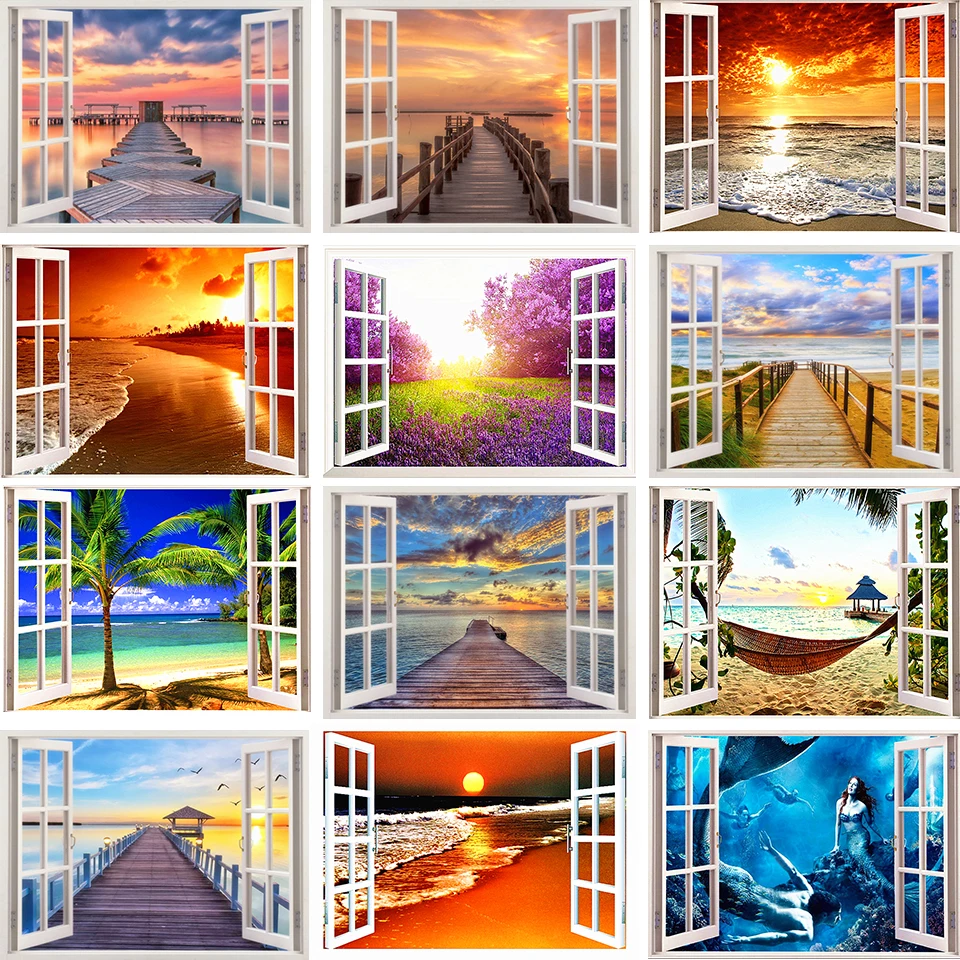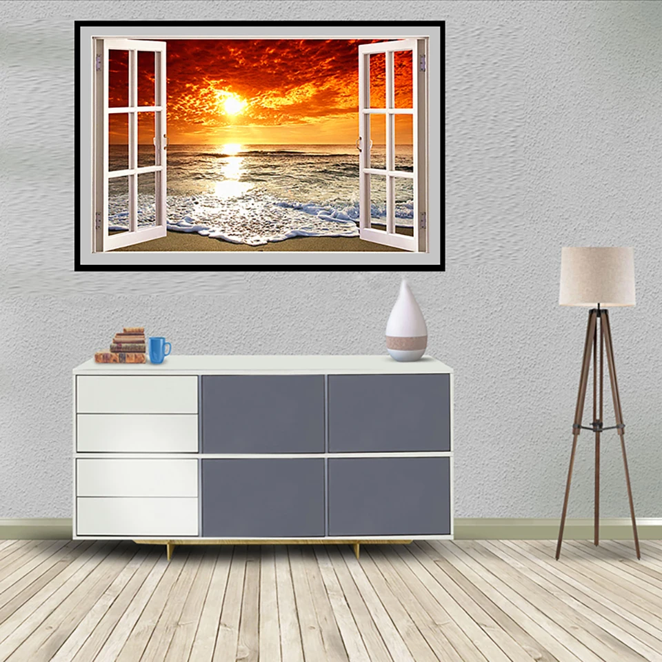 Картина из квадратных страз 5D "сделай сам", пейзаж, окно, вид на море, закат, Набор для вышивки крестиком, украшение для дома, Подарочная мозаика