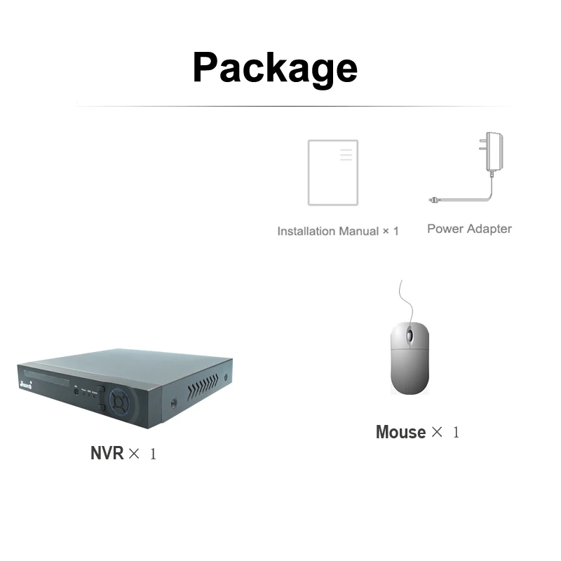4CH POE NVR x 1 + мышь x 1 + адаптер x 1 + руководство по установке x 1