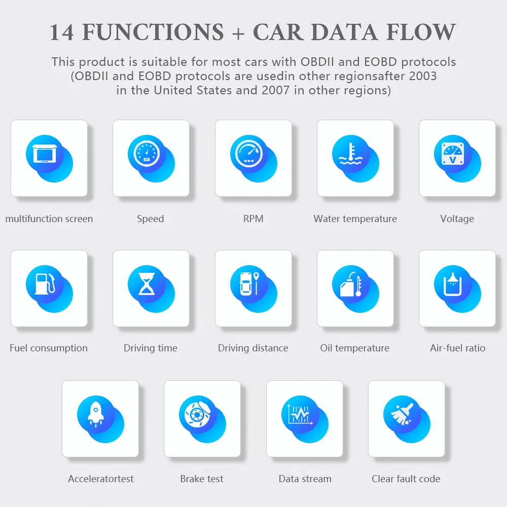Модель OBD2 может работать для бензиновых автомобилей OBD2, произведенных после 2004 года в США, и бензиновых автомобилей OBD2, произведенных после 2008 года в других странах.