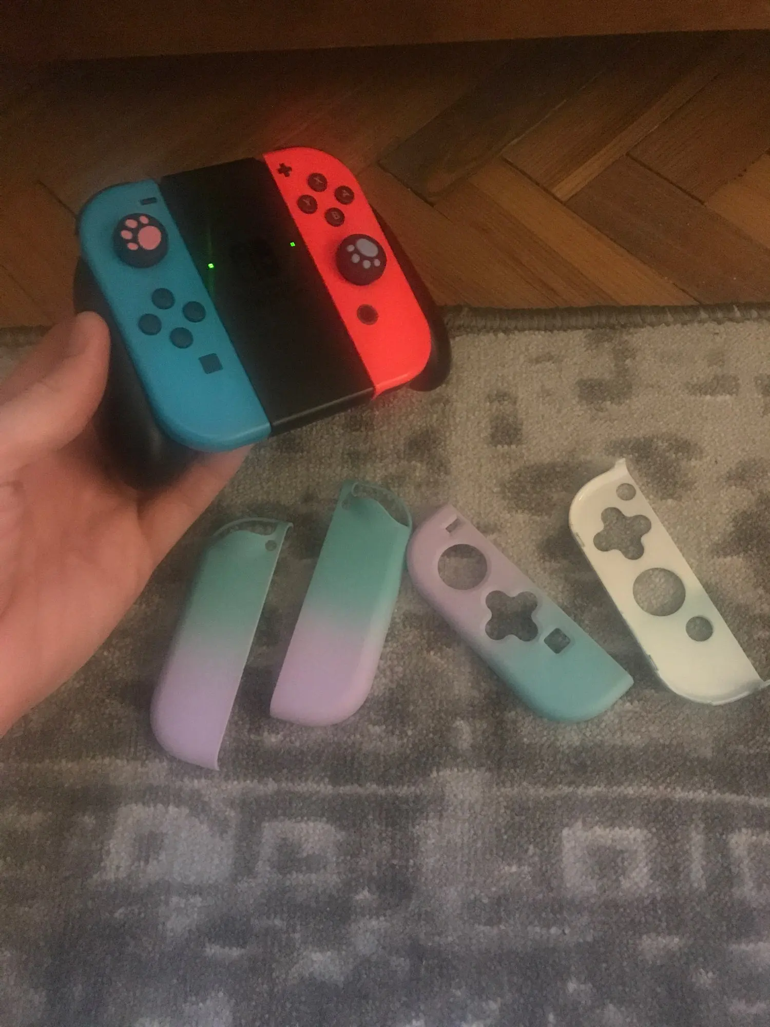 Крутые пластмассовые накладки на Switch. Цвет в жизни не такой яркий как на картинке. Сам пластик приятный на ощупь, но если у вас сухие руки то консоль может выскользнуть. Так же нужно быть аккуратным при защелкивании креплений - они могут сломаться очень быстро.