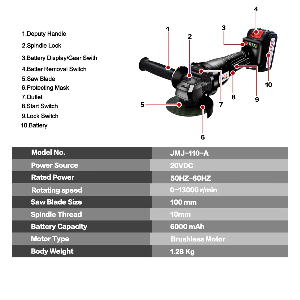 Модель номер Haowook JMJ-100-S Вес 3,5 кг Отличными режущими способностями Стальной стержень/диаметр трубки 10 мм Батарея Ёмкость 6000 мА-ч Номинальная Скорость 13000r/мин Защитная оболочка диаметр 125 мм Шлифовальные круги разных цветов 110 мм Номинальная Мощность 1000W Номинальное напряжение 20V DC Зарядка Вход Напряжение 100-240 В переменного тока, 50/60 Гц Нижняя плита Размеры 37 см * 13 см Штепсельная Вилка Штепсельная Вилка стандарта ЕС/штепсельная вилка стандарта Великобритании/штепсельная вилка стандарта США/штепсельная вилка стандарта Австралии