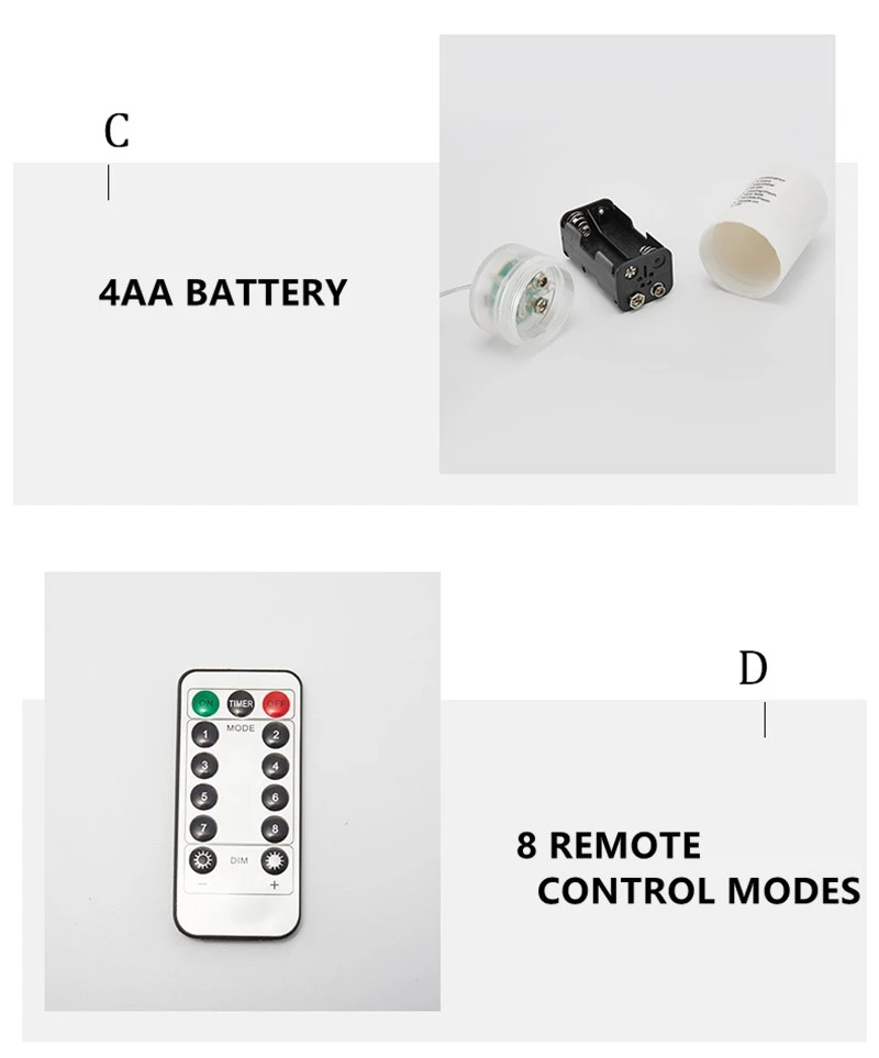 Материал: медный провод + светодиодный светильник + пластиковая Батарейная Коробка Цвет: теплый белый мощность: 4x AA батареи требуют (не входят в комплект) Рабочее напряжение: 6 В Материал корпуса: АБС-пластик Уровень водонепроницаемости: IP65