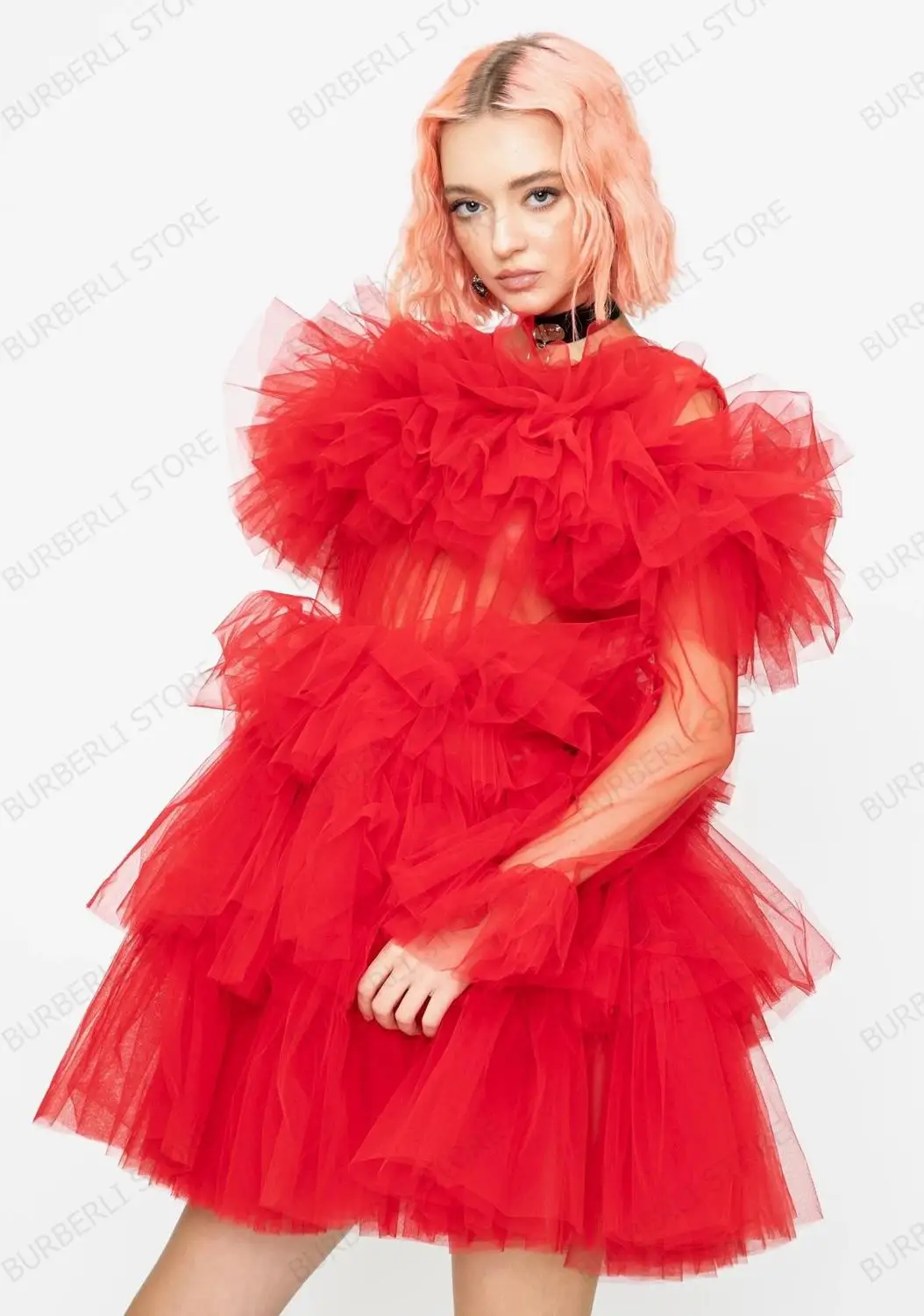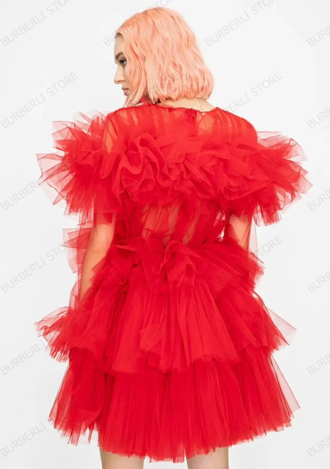 Женское платье с юбкой-пачкой, красное короткое платье из тюля с оборками в несколько рядов, лето 2019