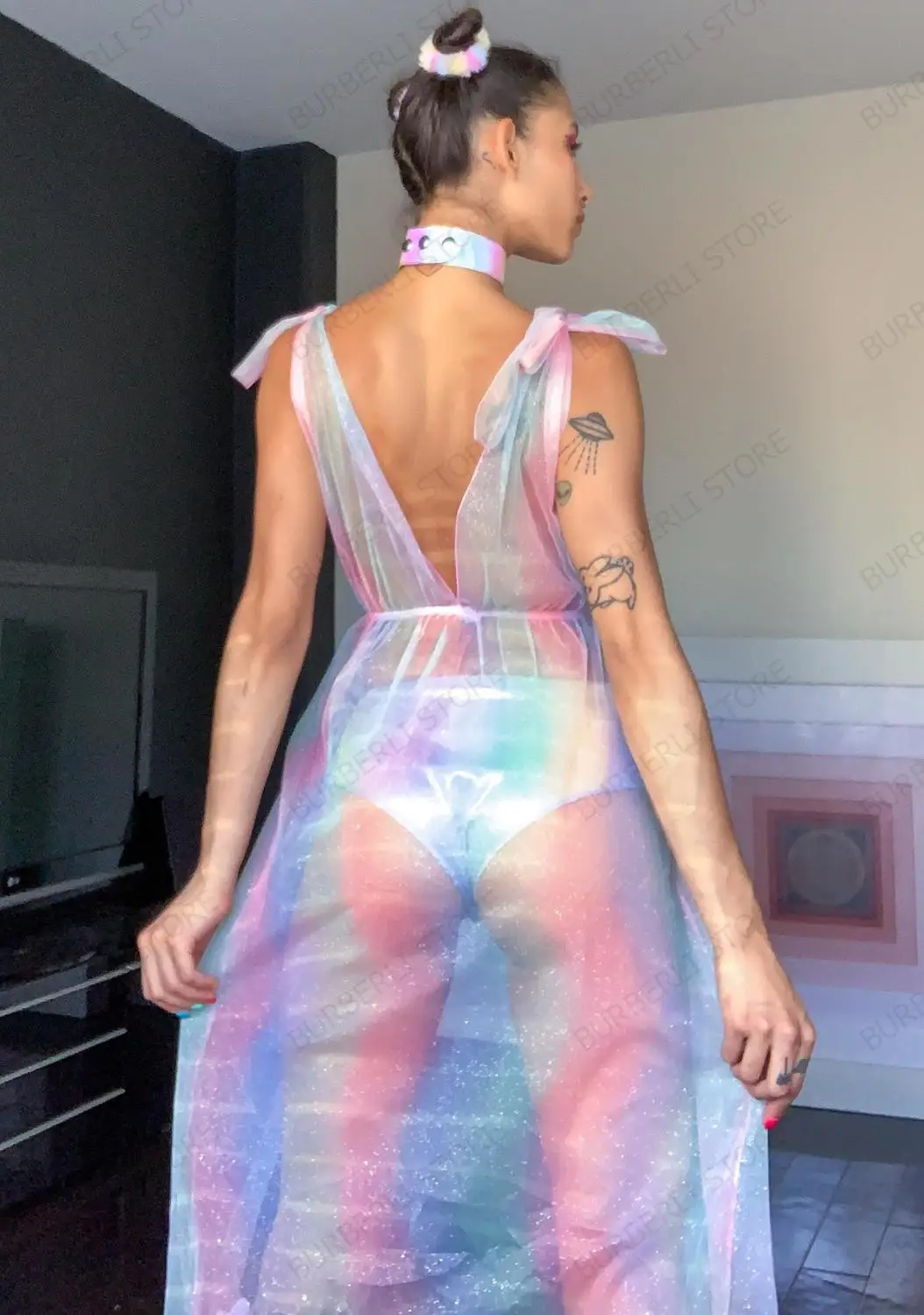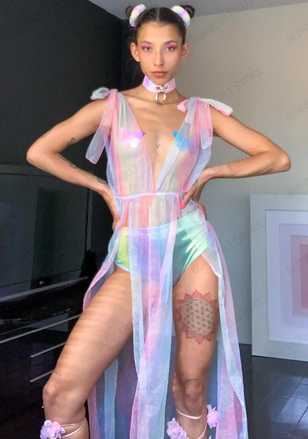 Соблазнительное Радужное платье из тюля для женщин, Длинное разноцветное платье с V-образным вырезом и высоким разрезом, выполненное по индивидуальному заказу, женское платье