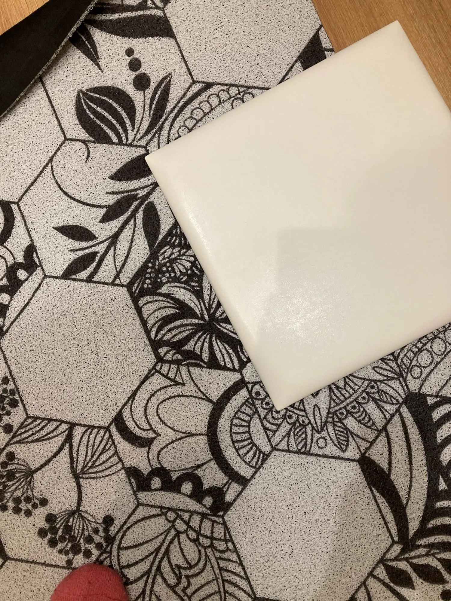 Коврик шёл долго. Заказала 16 декабря. Доставили до двери 29 января, хотя таможню в России посылка прошла уже 15 января... Коврик соответствует заказанным размерам. Толщина, на мой взгляд оптимальная: не слишком толстый, чтобы об него спотыкаться и не слишком тонкий, чтобы не выполнял свою функцию... Цвет не белый, как на картинке, а грязно белый... Прилагаю фото рядом с чисто белым предметом для контраста... Мне не очень принципиально, но чисто белый более нарядно смотрелся бы... Легкий запах резины присутствует. Надеюсь, быстро выветрится. Есть серьезный залом на месте сгиба. Надеюсь, что разгладится... С продавцом не общалась (не было необходимости)