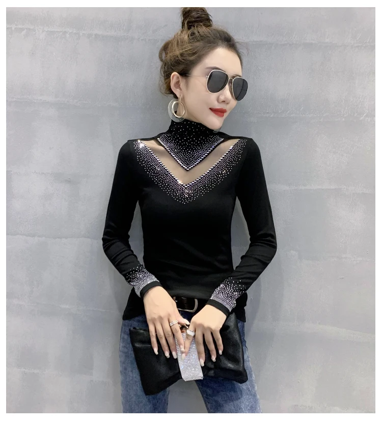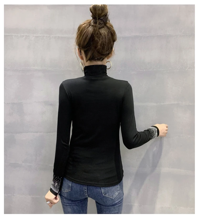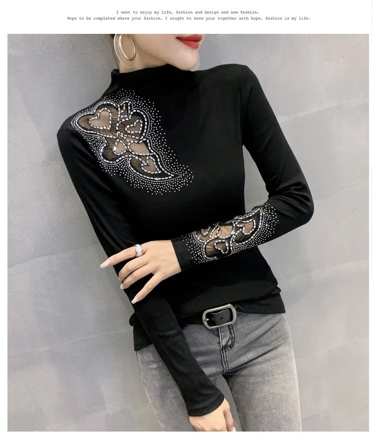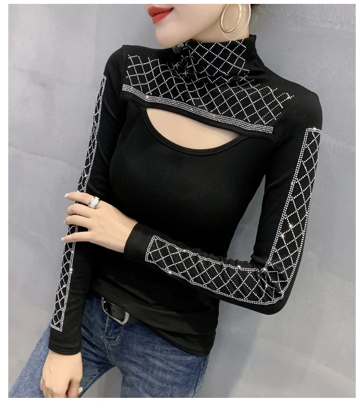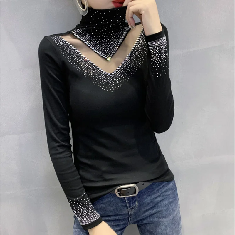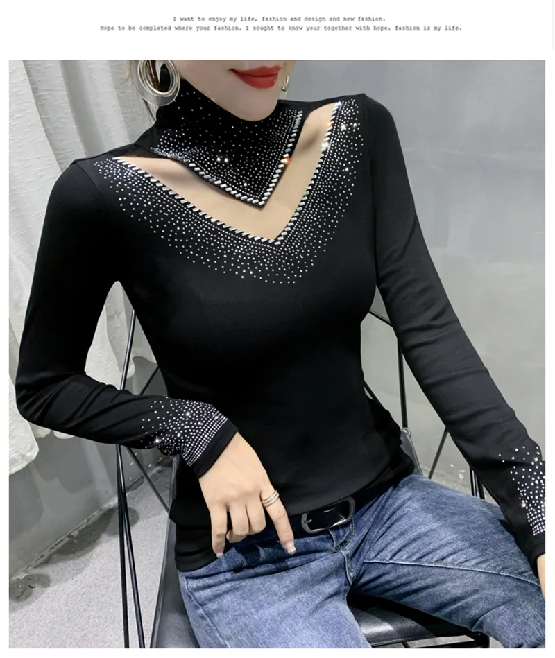 Женская футболка с длинным рукавом, черная Повседневная водолазка со стразами, элегантные облегающие топы, осень 2021