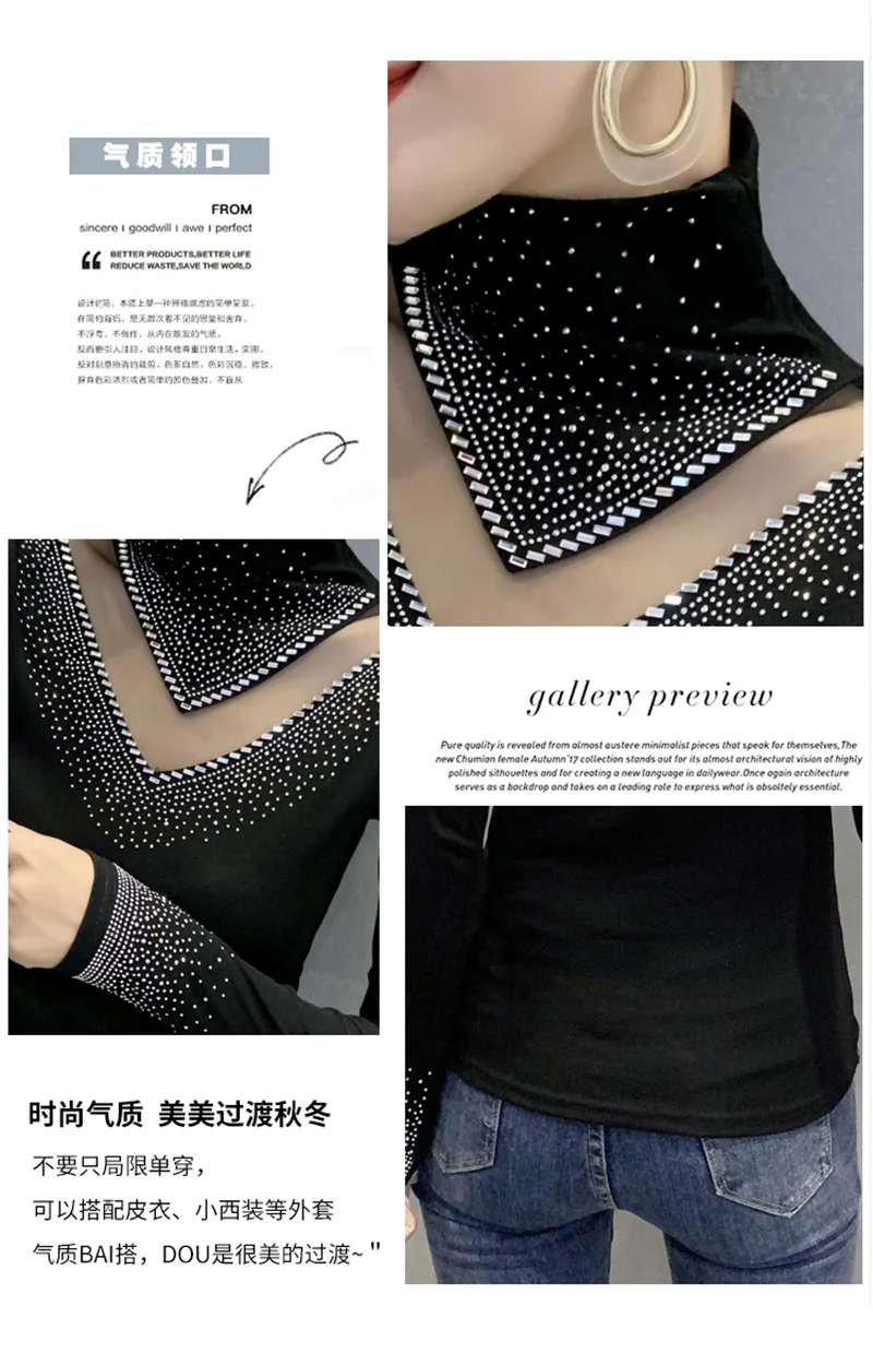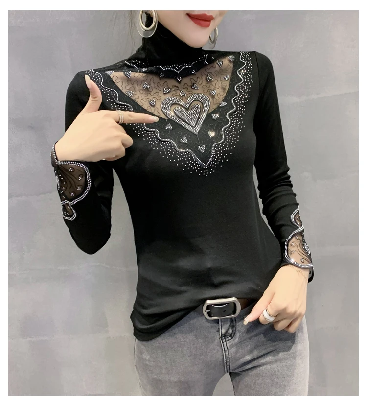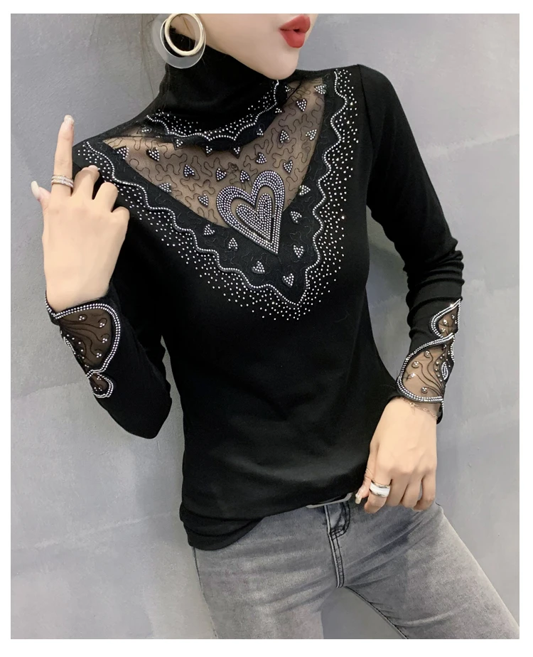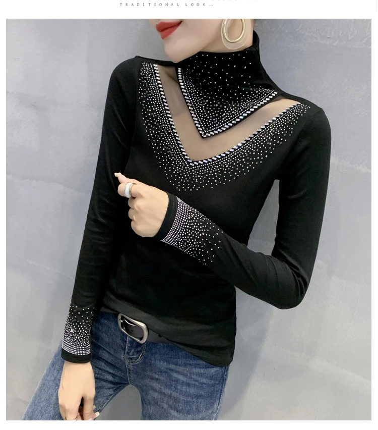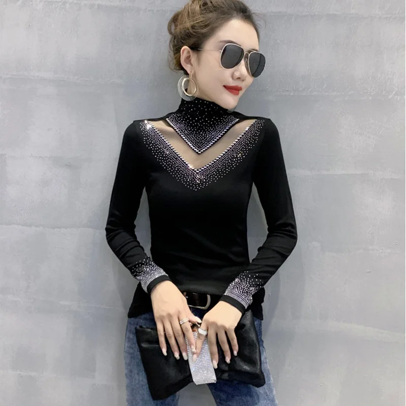 Женская футболка с длинным рукавом, черная Повседневная водолазка со стразами, элегантные облегающие топы, осень 2021