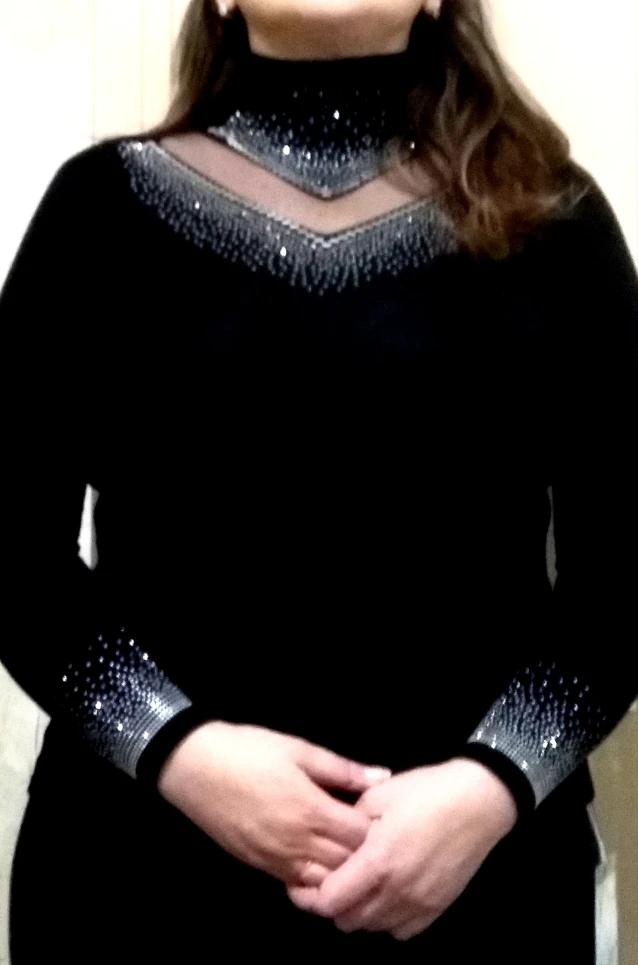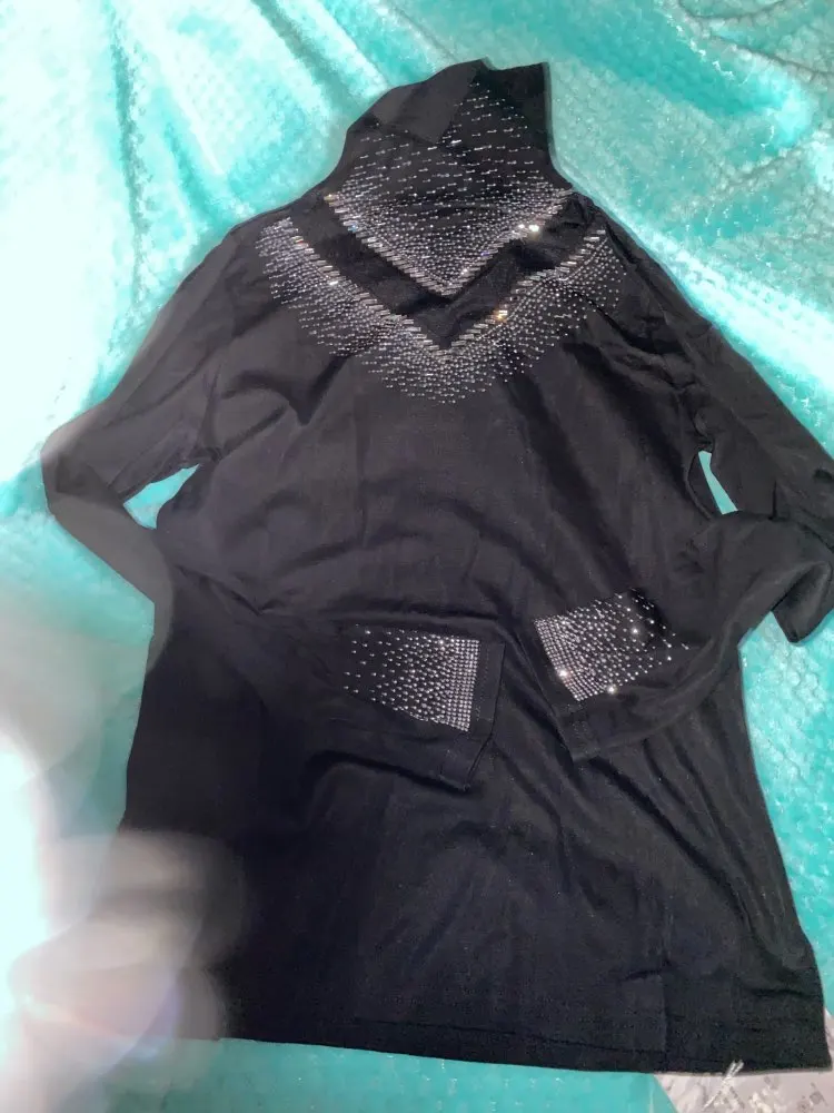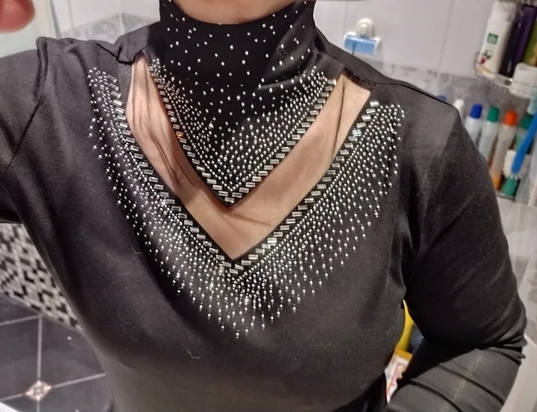 очень тоненькая водолазка, футболочная приятная ткань. но качество хорошее, камни сверкают, сидит и смотрится очень хорошо