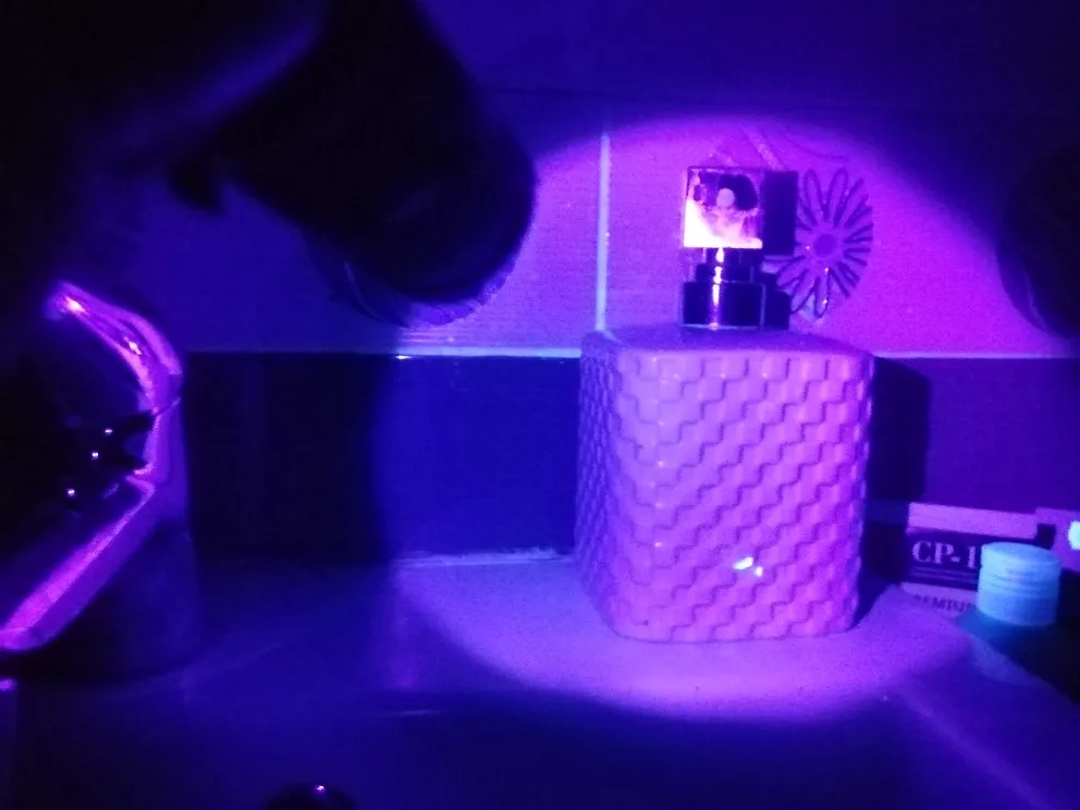 Брал сразу два фонаря (365нМ и 395нМ), для поверки УФ маркировок.Для интереса зашел с ним посветить в туалет и ванну...Заходить лучше сразу с Валидолом :)