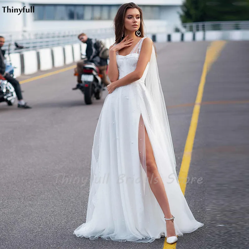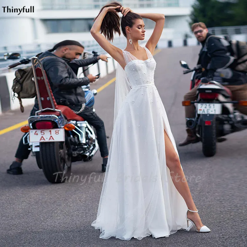Свадебное платье Thinyfull в стиле бохо для принцессы, пляжное платье невесты с разрезом по бокам и бусинами, с завязкой сзади