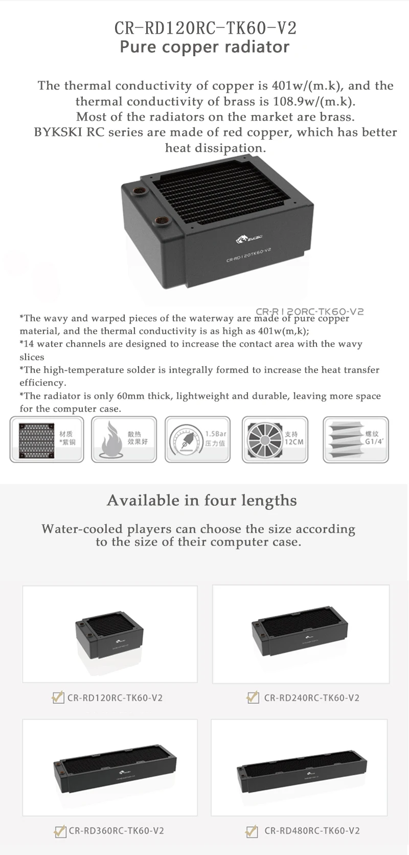 Однорядный радиатор Bykski, 60 мм, толщина 120 мм, медный радиатор ...