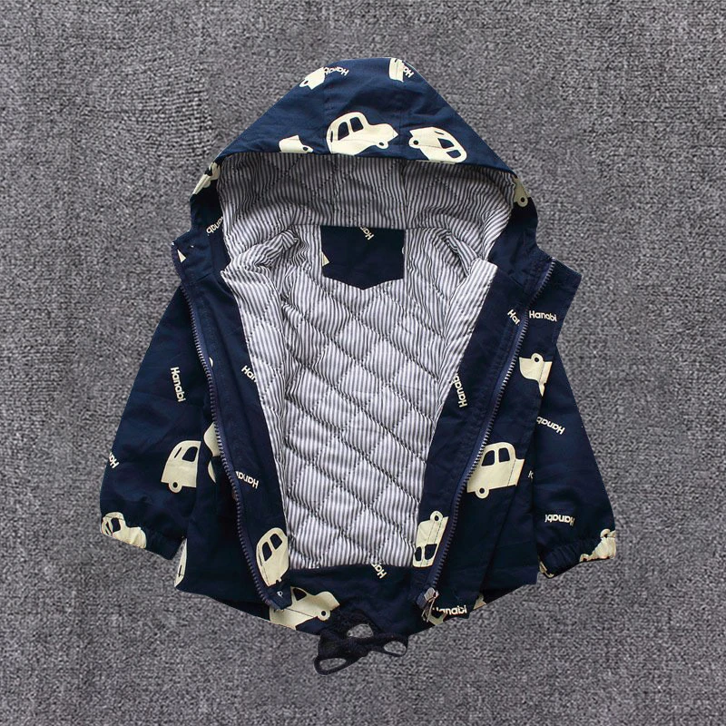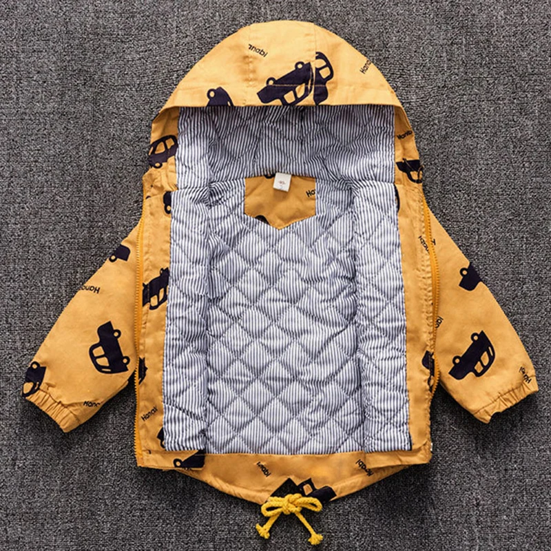 Одежда для маленьких мальчиков, детская хлопковая куртка, зимняя утепленная куртка с мультяшным принтом автомобиля, ветровка для маленьких мальчиков, куртка с капюшоном